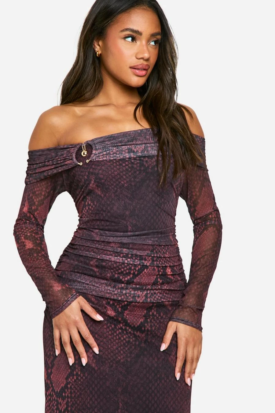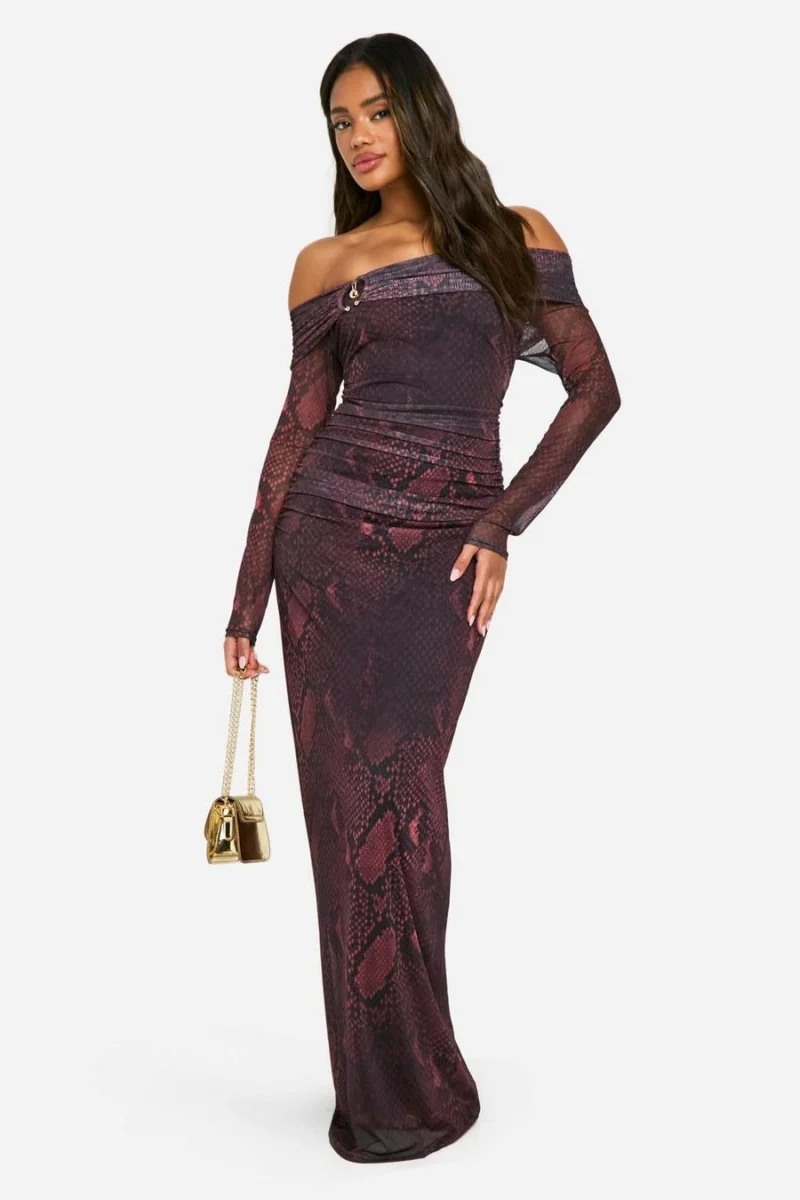 BOOHOO Mesh Snake Print Off Shoulder Maxi Dress