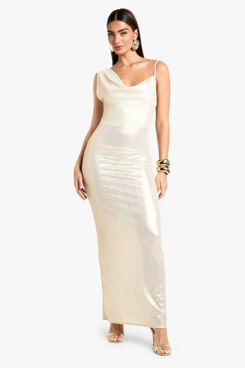 BOOHOO Metallic Foil Rib One Shoulder Maxi Dress