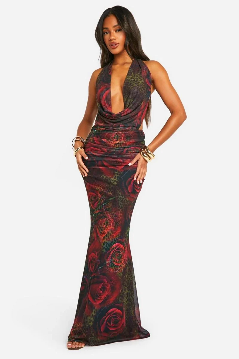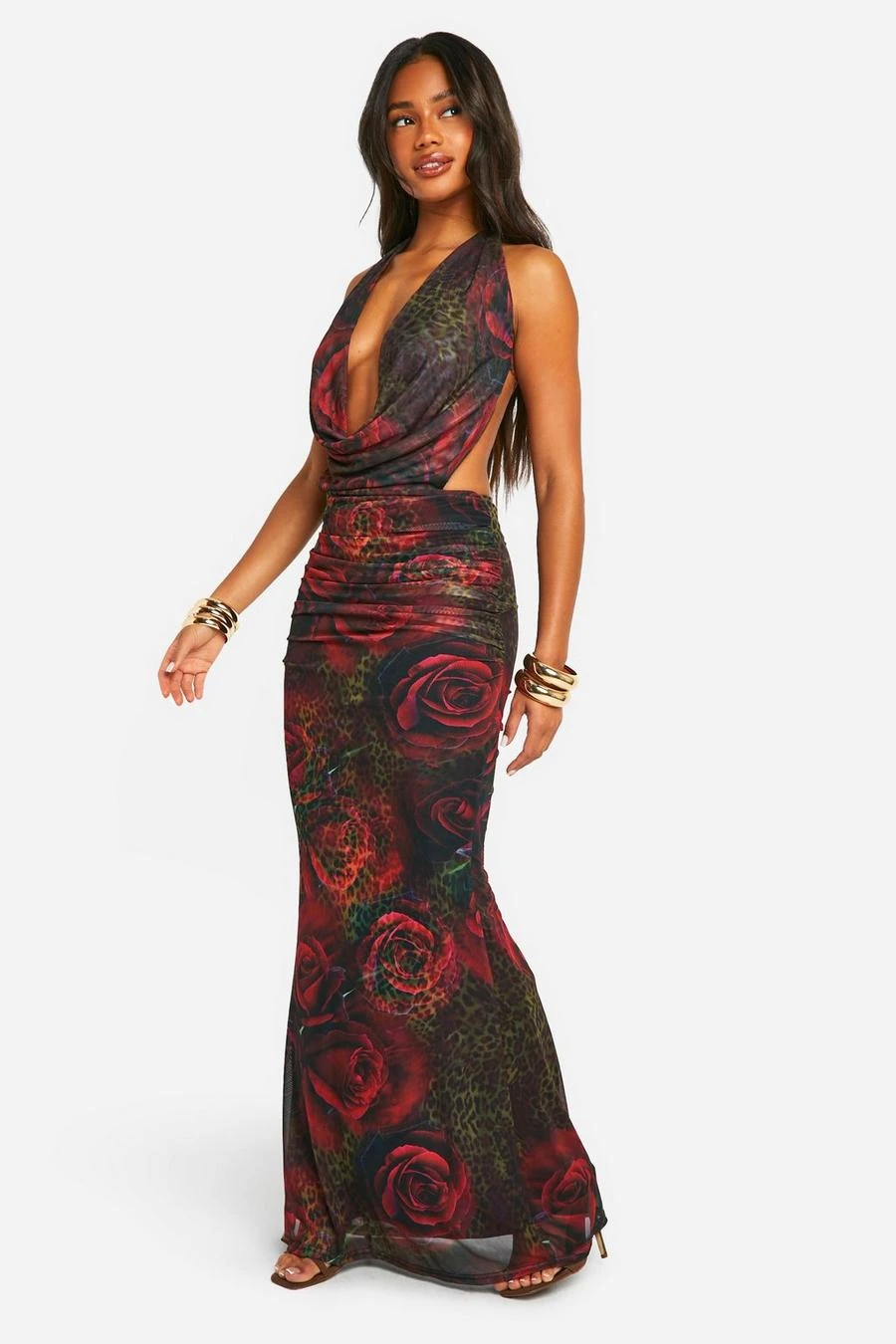BOOHOO Mixed Print Leopard Plunge Ruched Bum Maxi Dress
