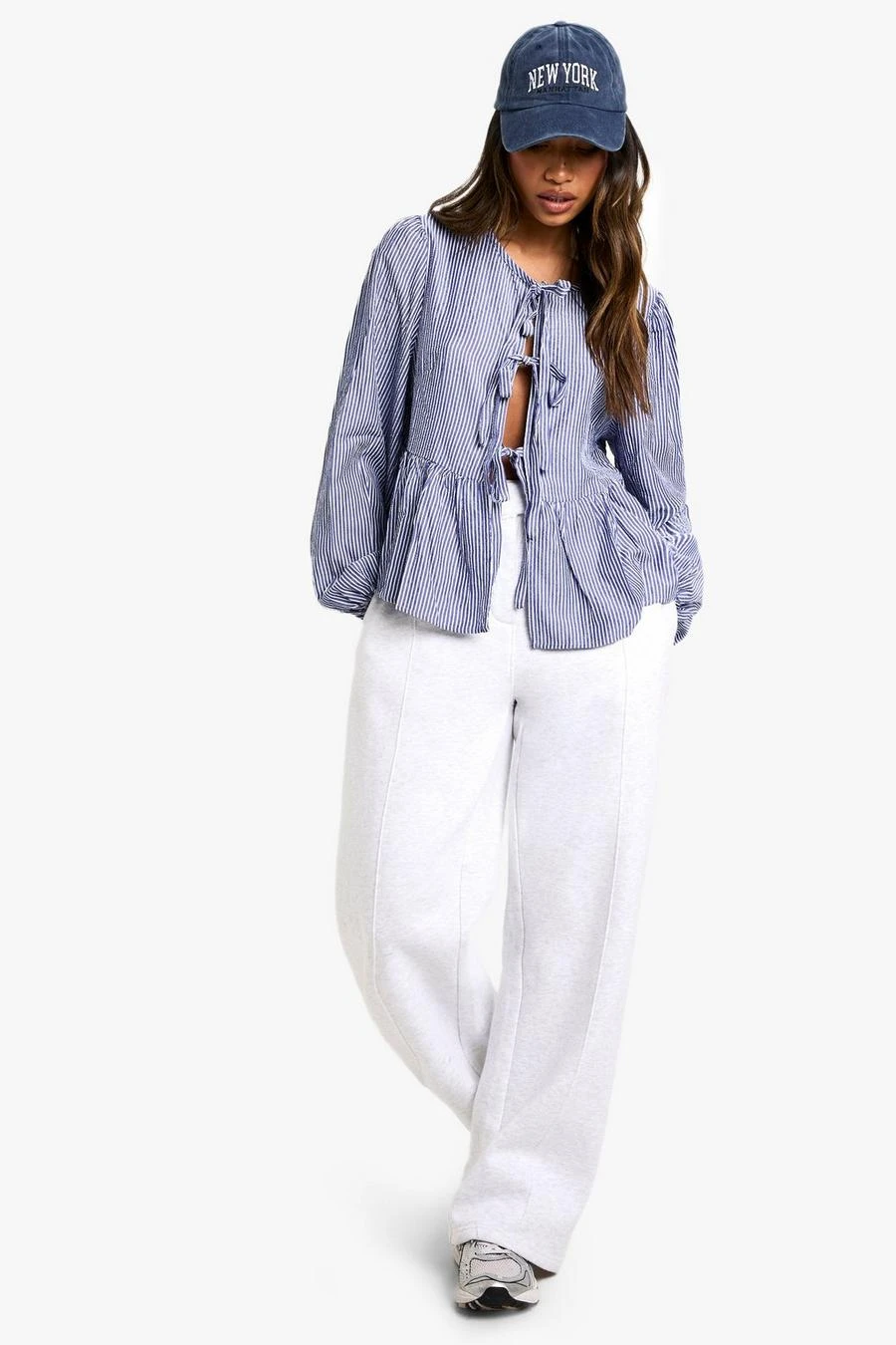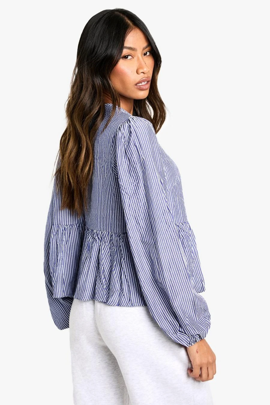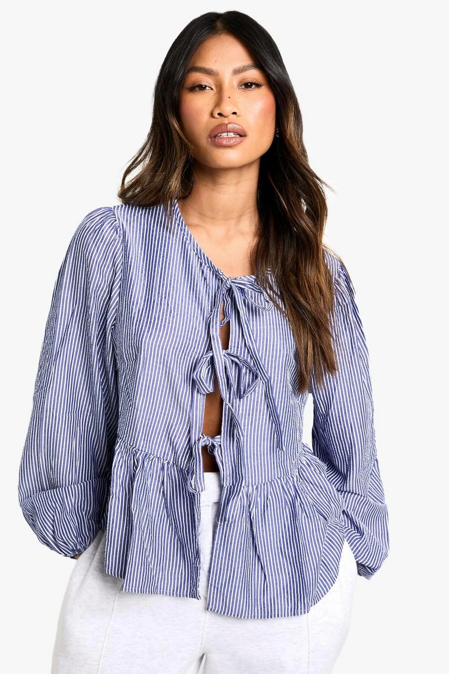 BOOHOO Navy Pinstripe Tie Front Puff Long Sleeve Smock Top