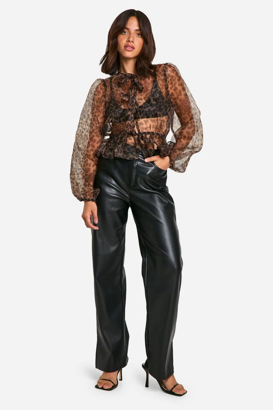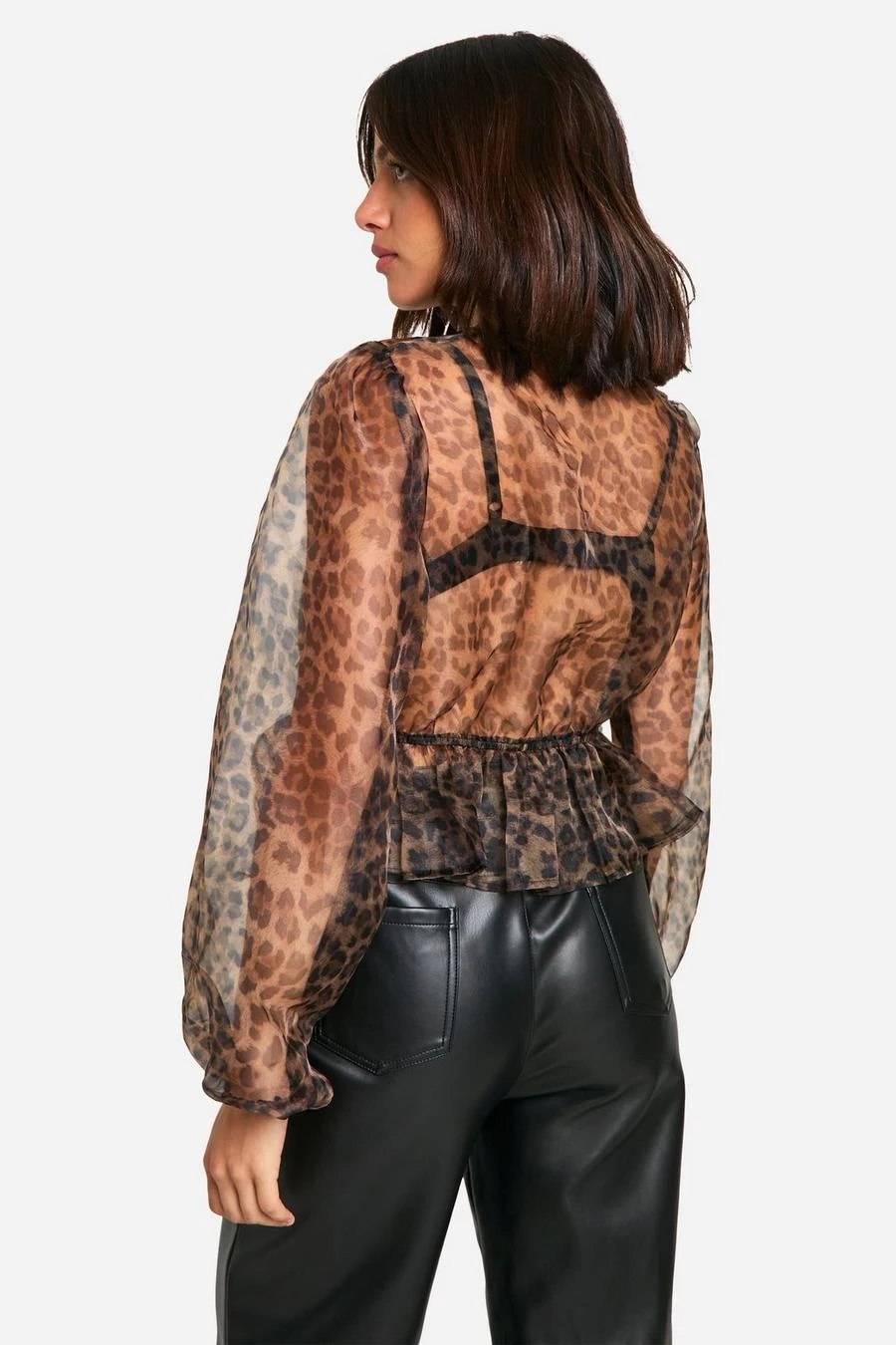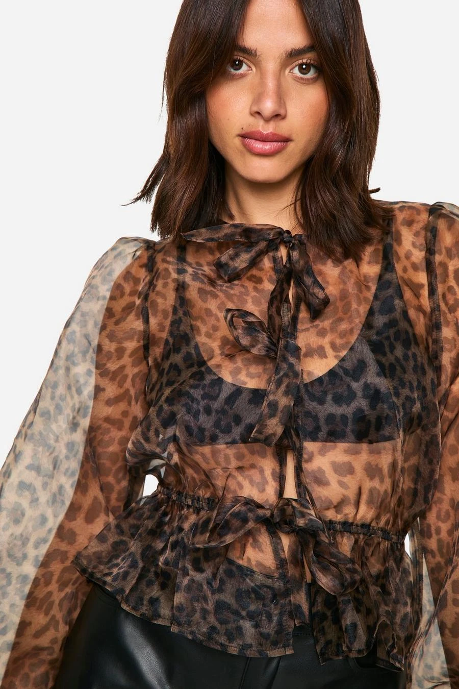 BOOHOO Organza Leopard Print Tie Front Puff Long Sleeve Top