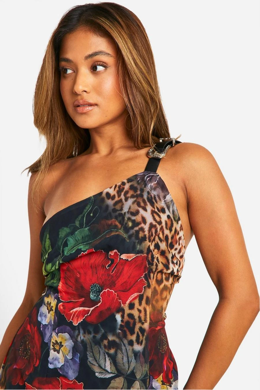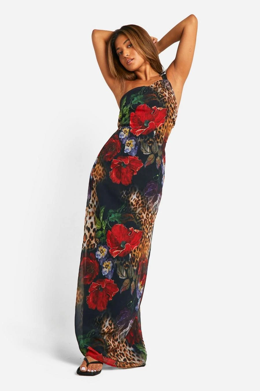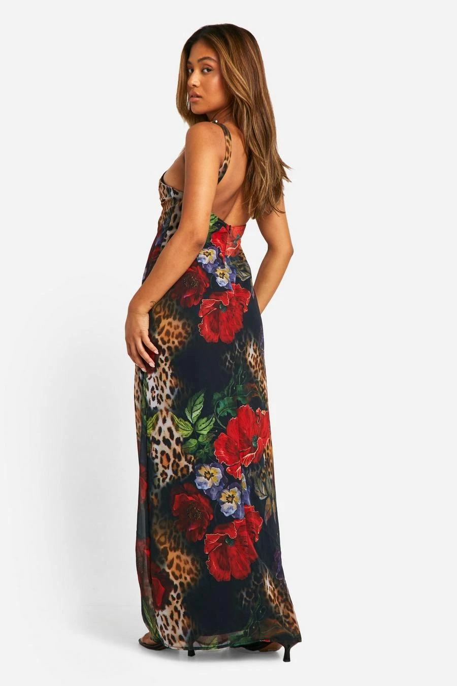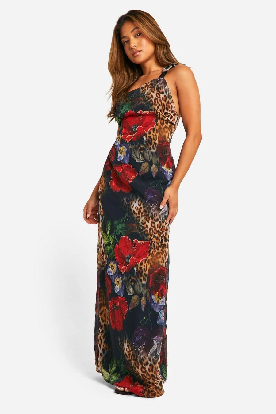 BOOHOO Petite Belt Detail Leopard Chiffon Maxi Dress