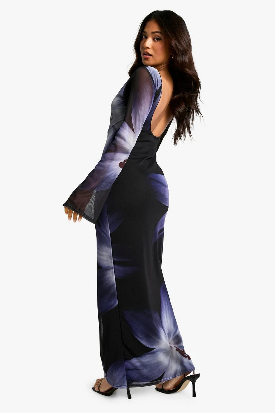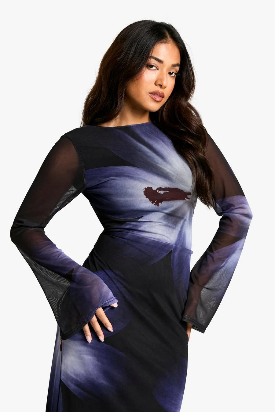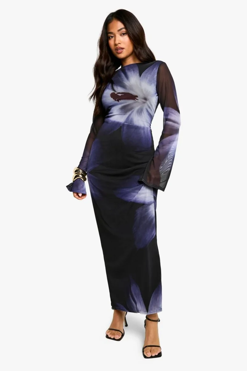 BOOHOO Petite Bold Floral Long Sleeve Mesh Maxi Dress