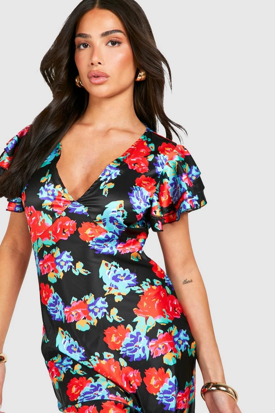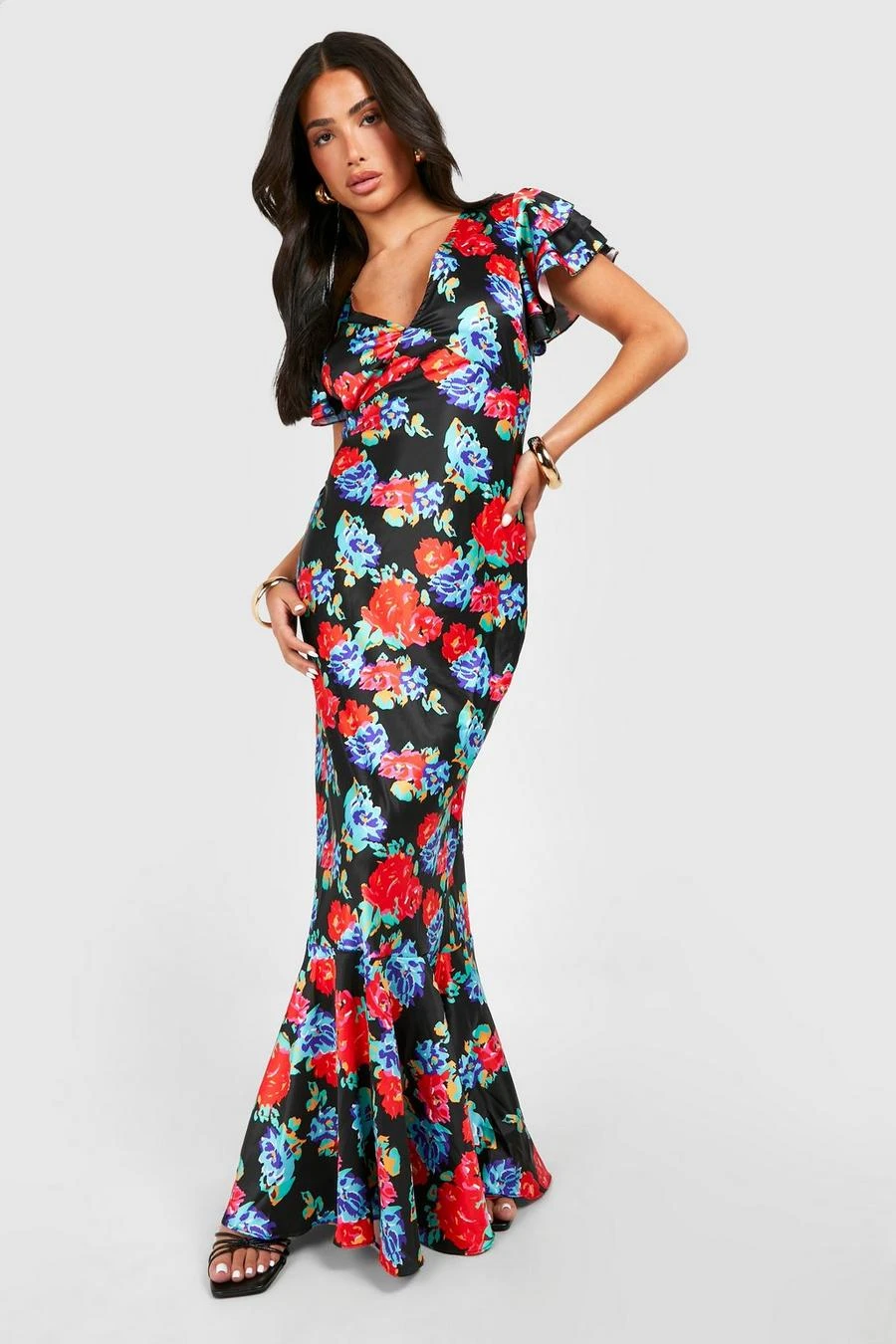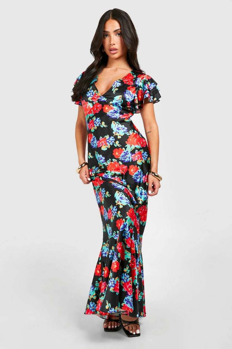 BOOHOO Petite Floral V Neck Ruffle Hem Maxi Dress