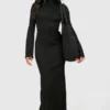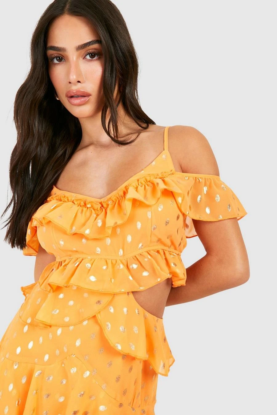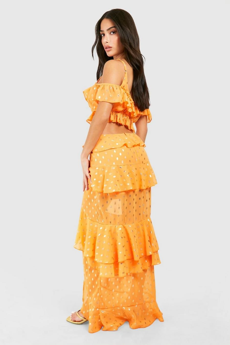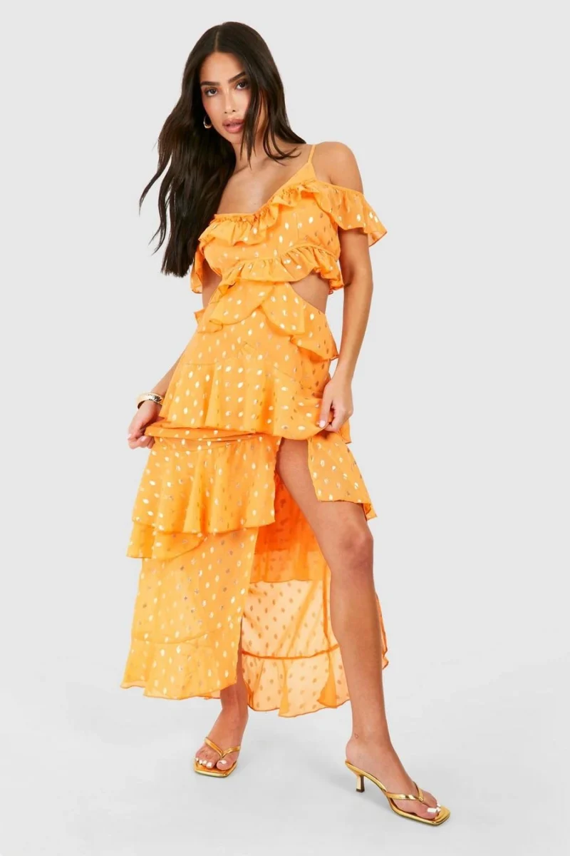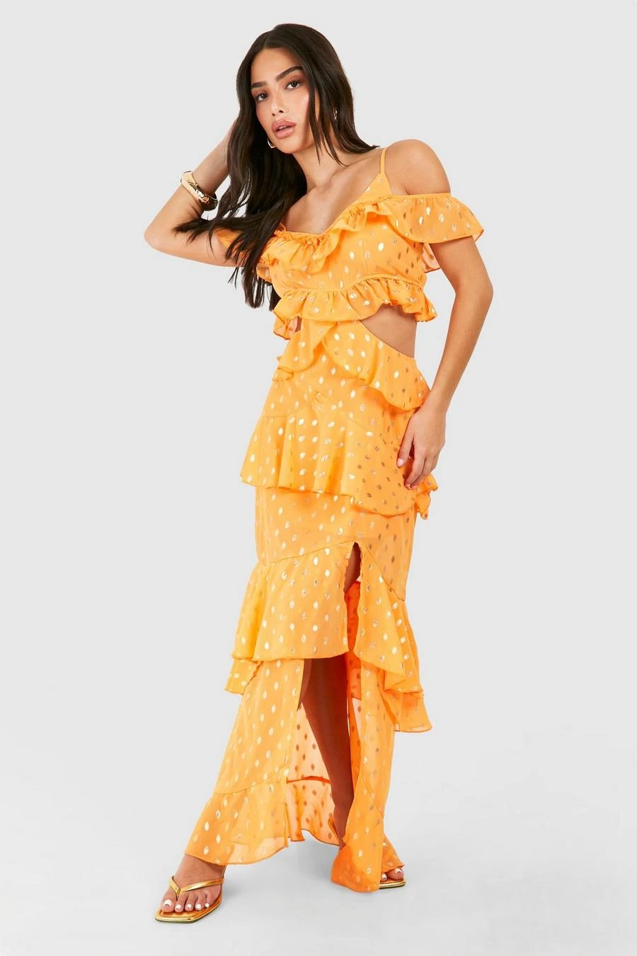 BOOHOO Petite Metallic Dobby Ruffle Maxi Dress