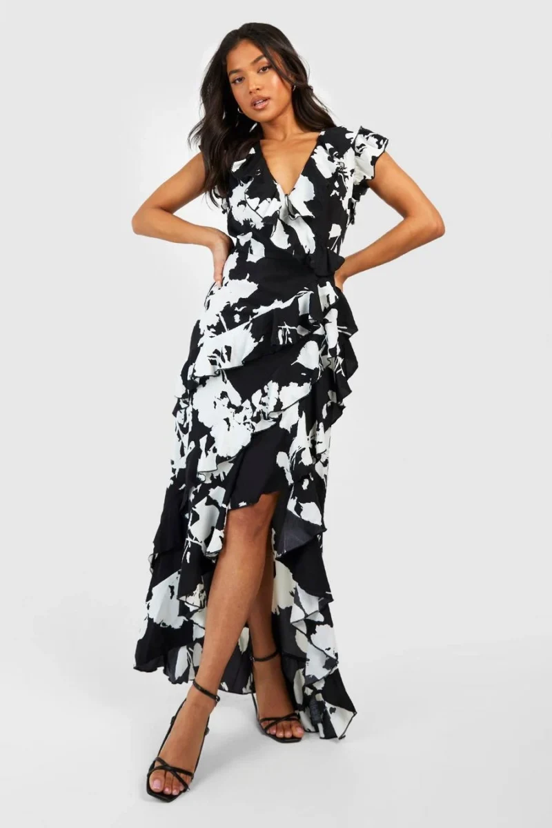 BOOHOO Petite Mono Floral Wrap Ruffle Maxi Dress