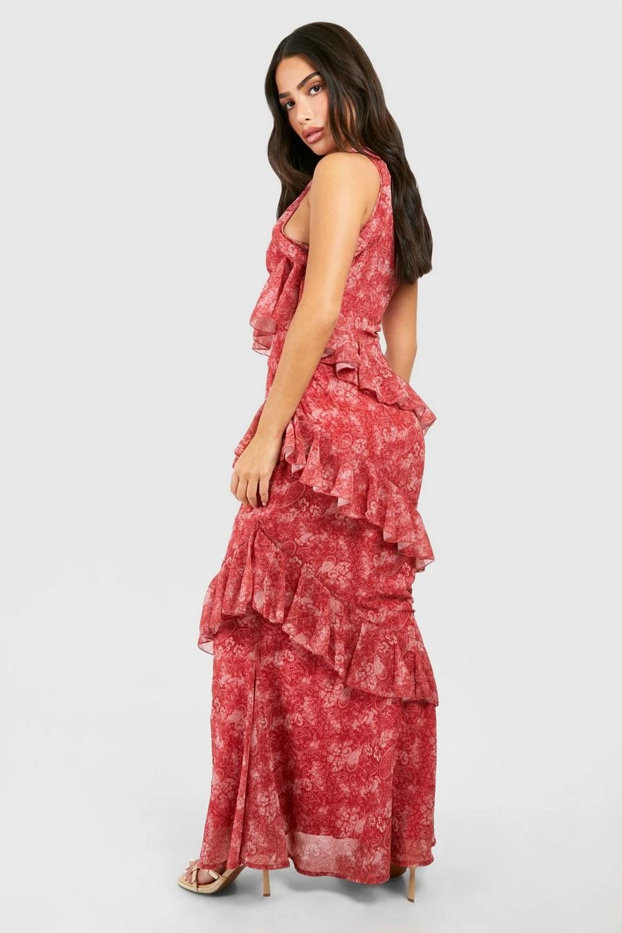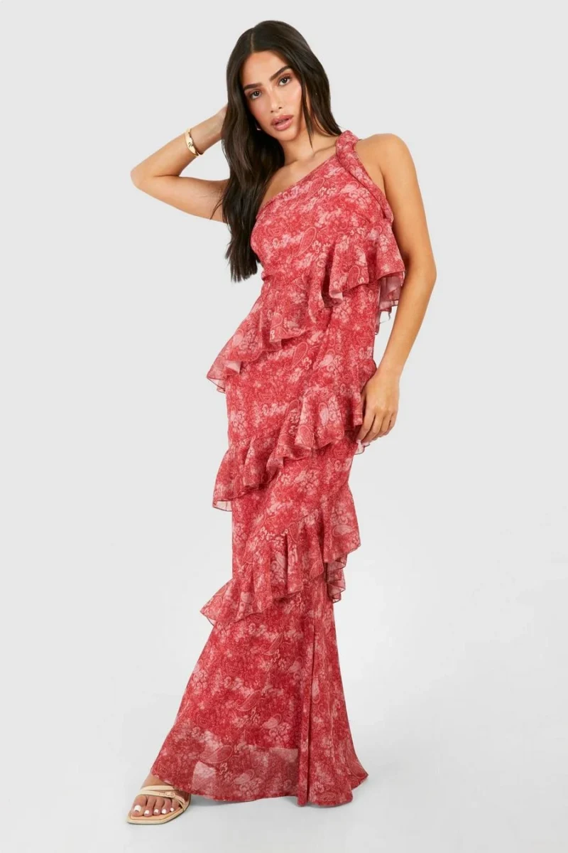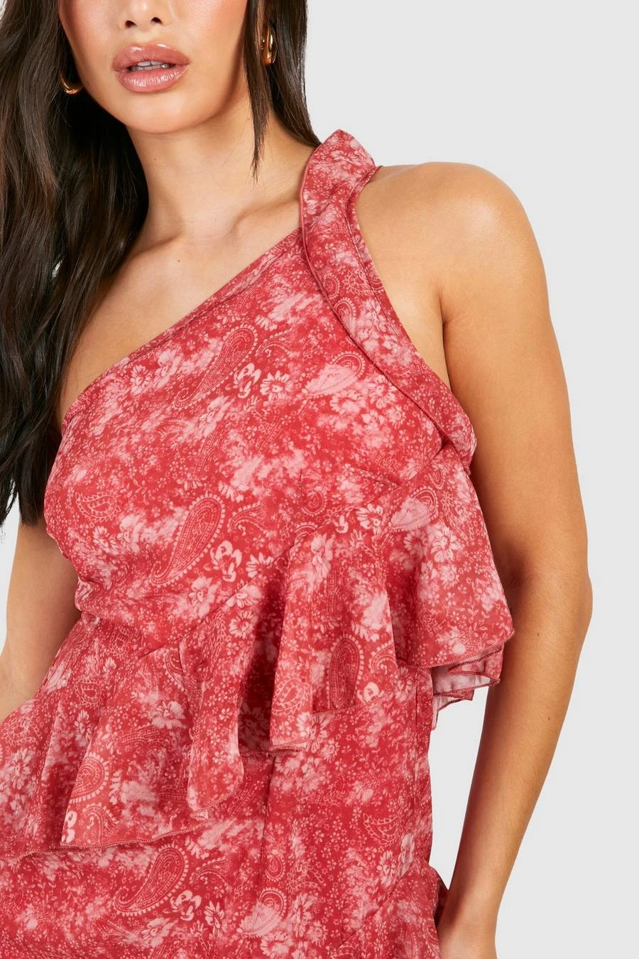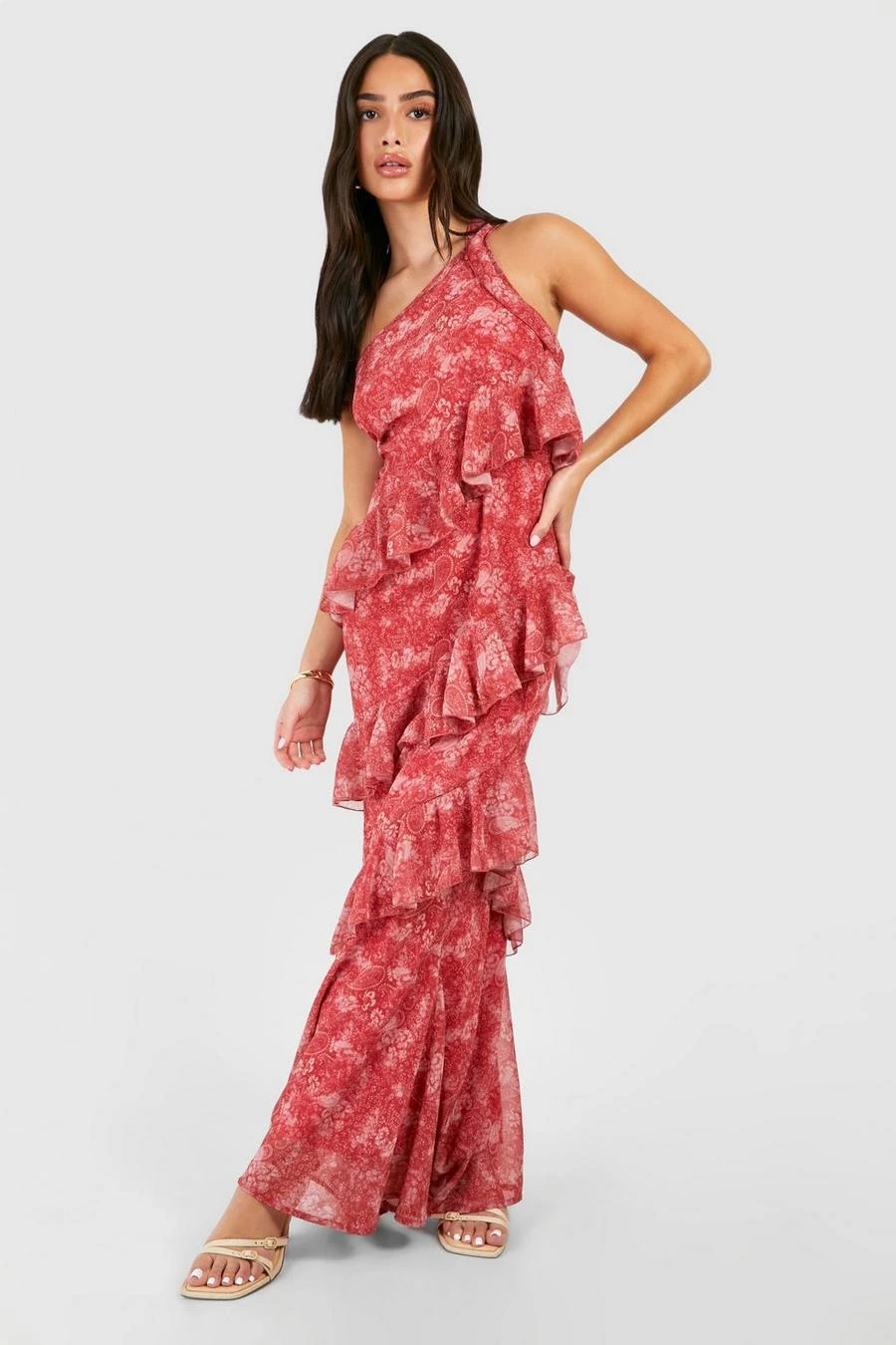 BOOHOO Petite Paisley Ruffle One Shoulder Maxi Dress