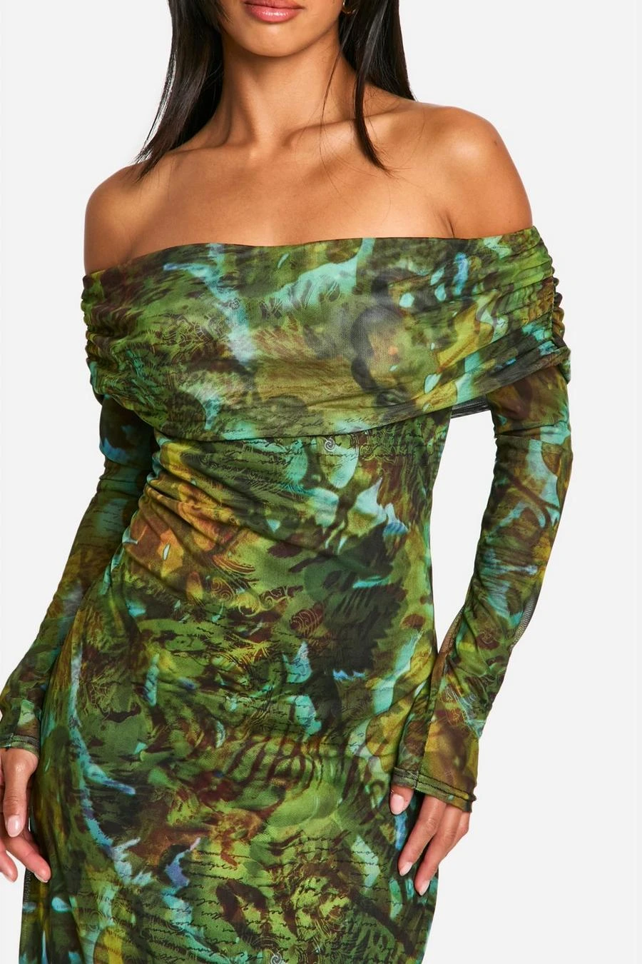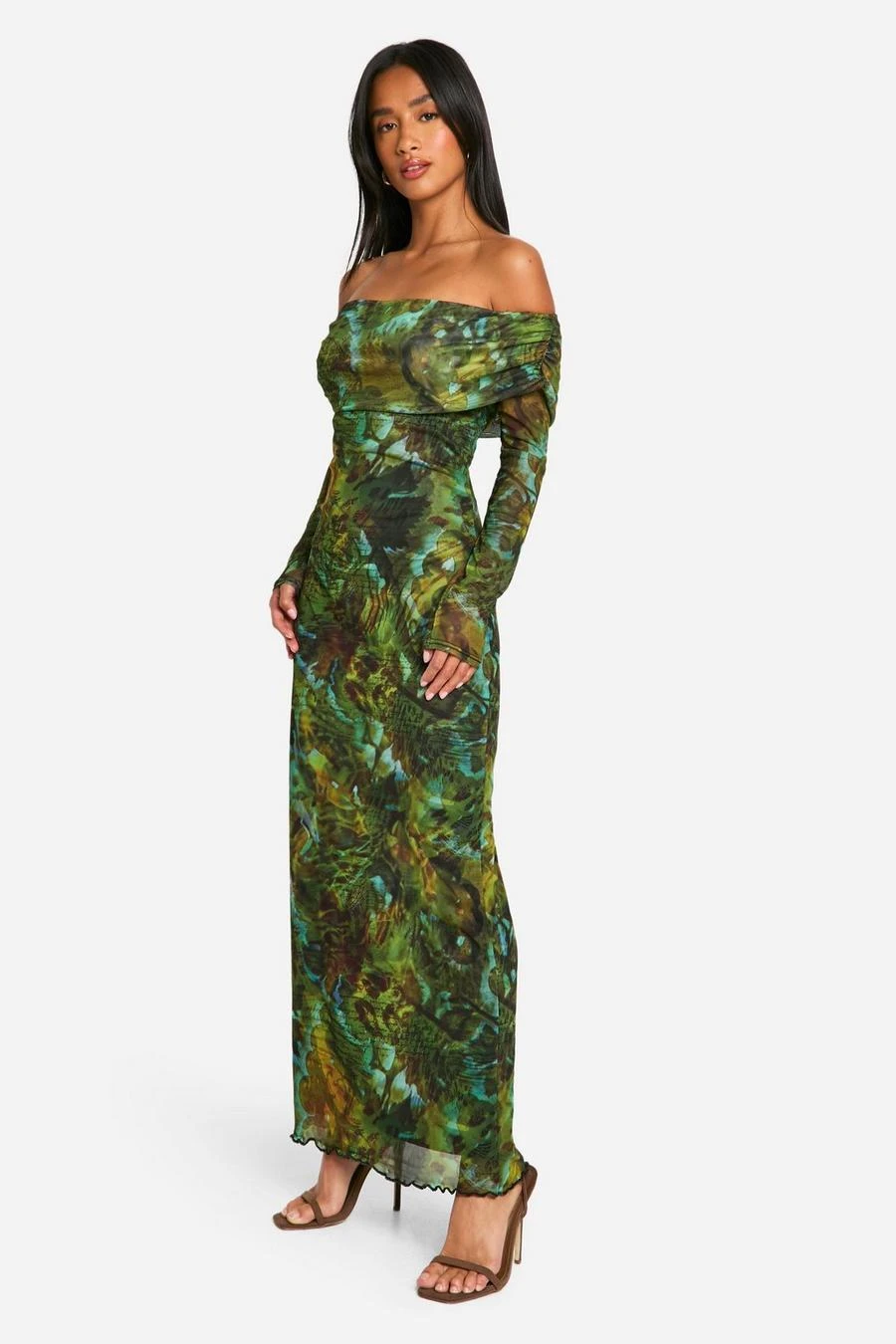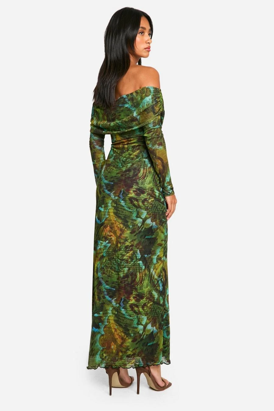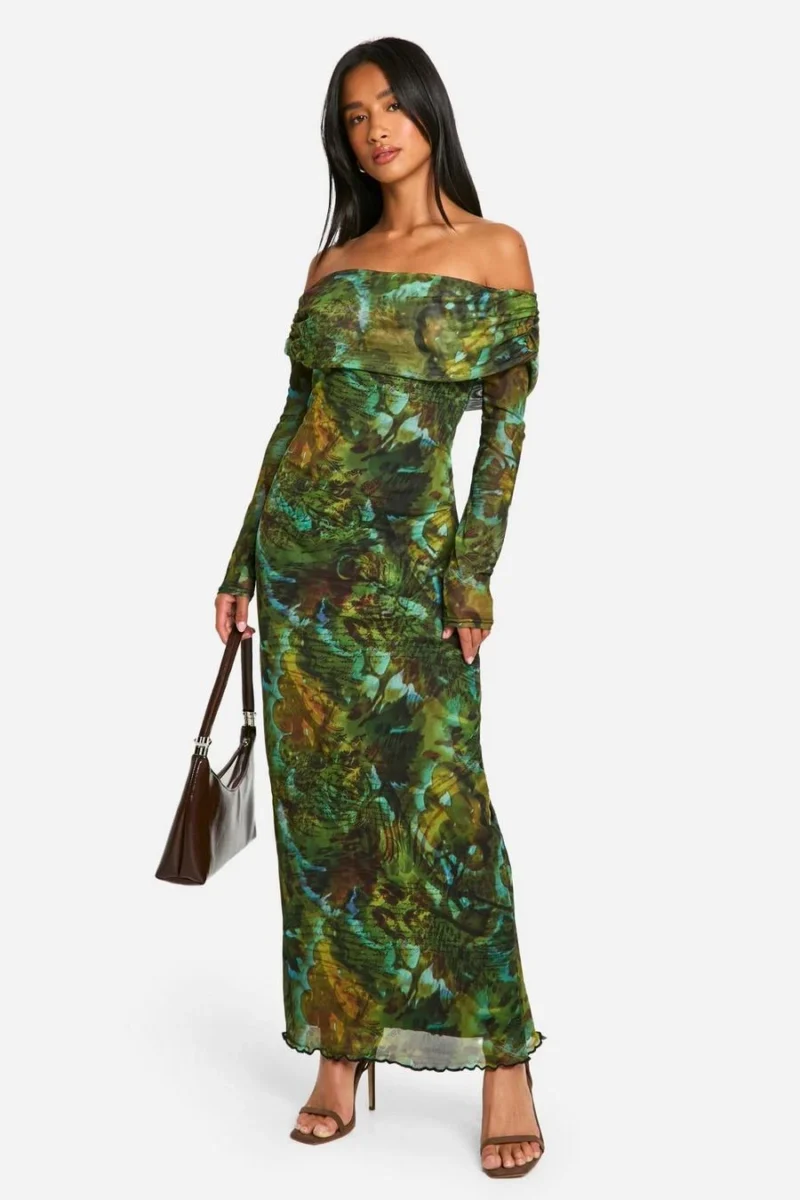 BOOHOO Petite Script Print Mesh Bardot Maxi Dress