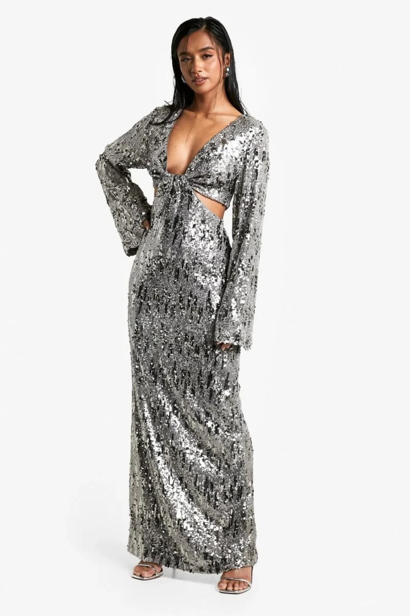 BOOHOO Petite Sequin Twist Front Maxi Dress