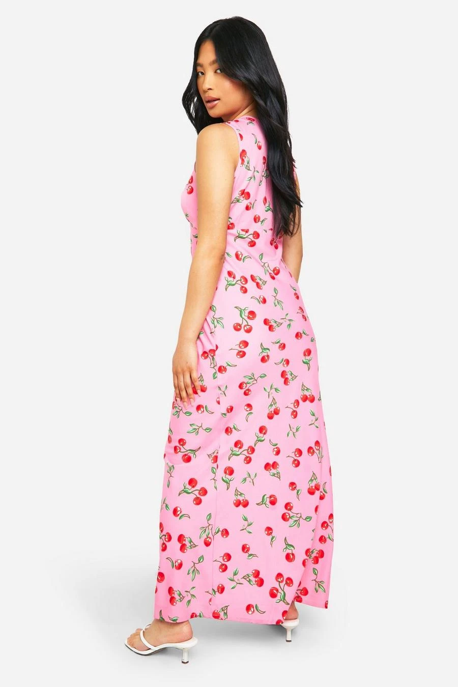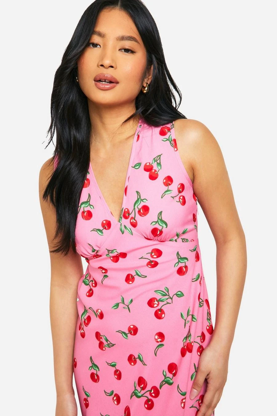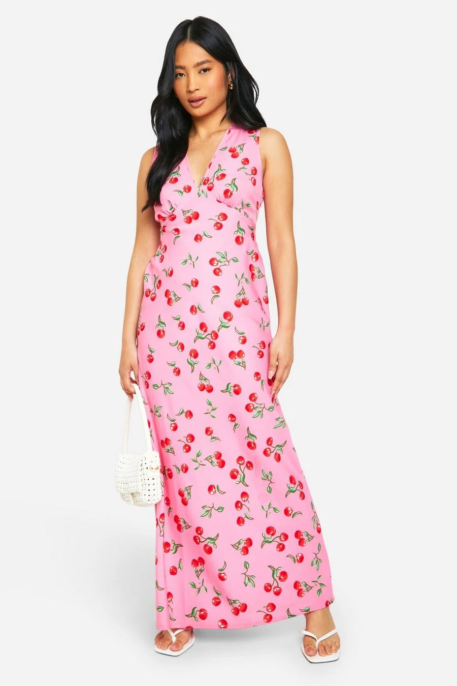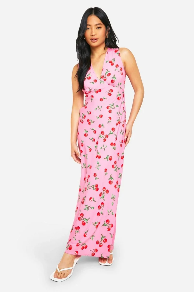 BOOHOO Petite V Neck Cherry Print Maxi Slip Dress