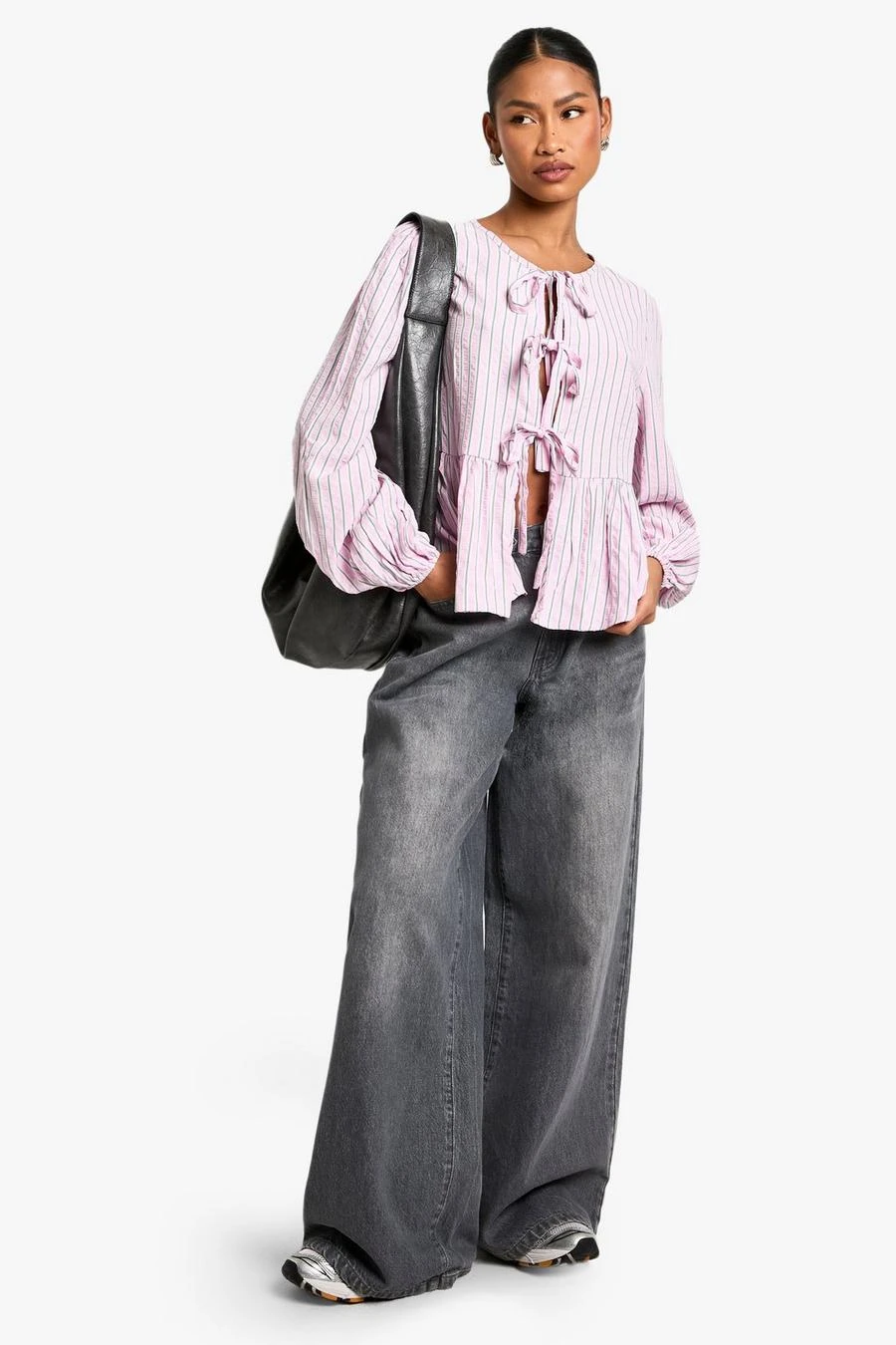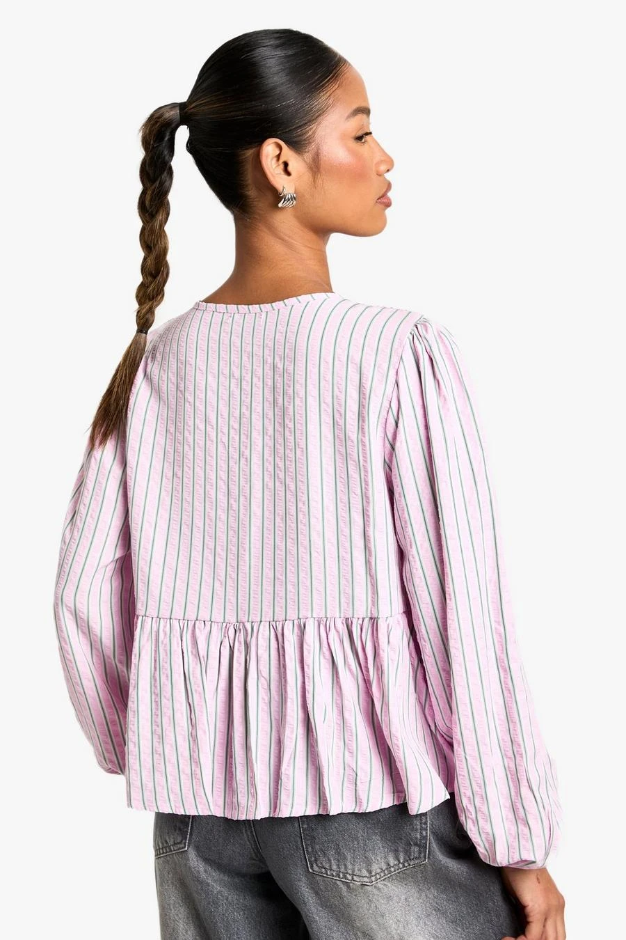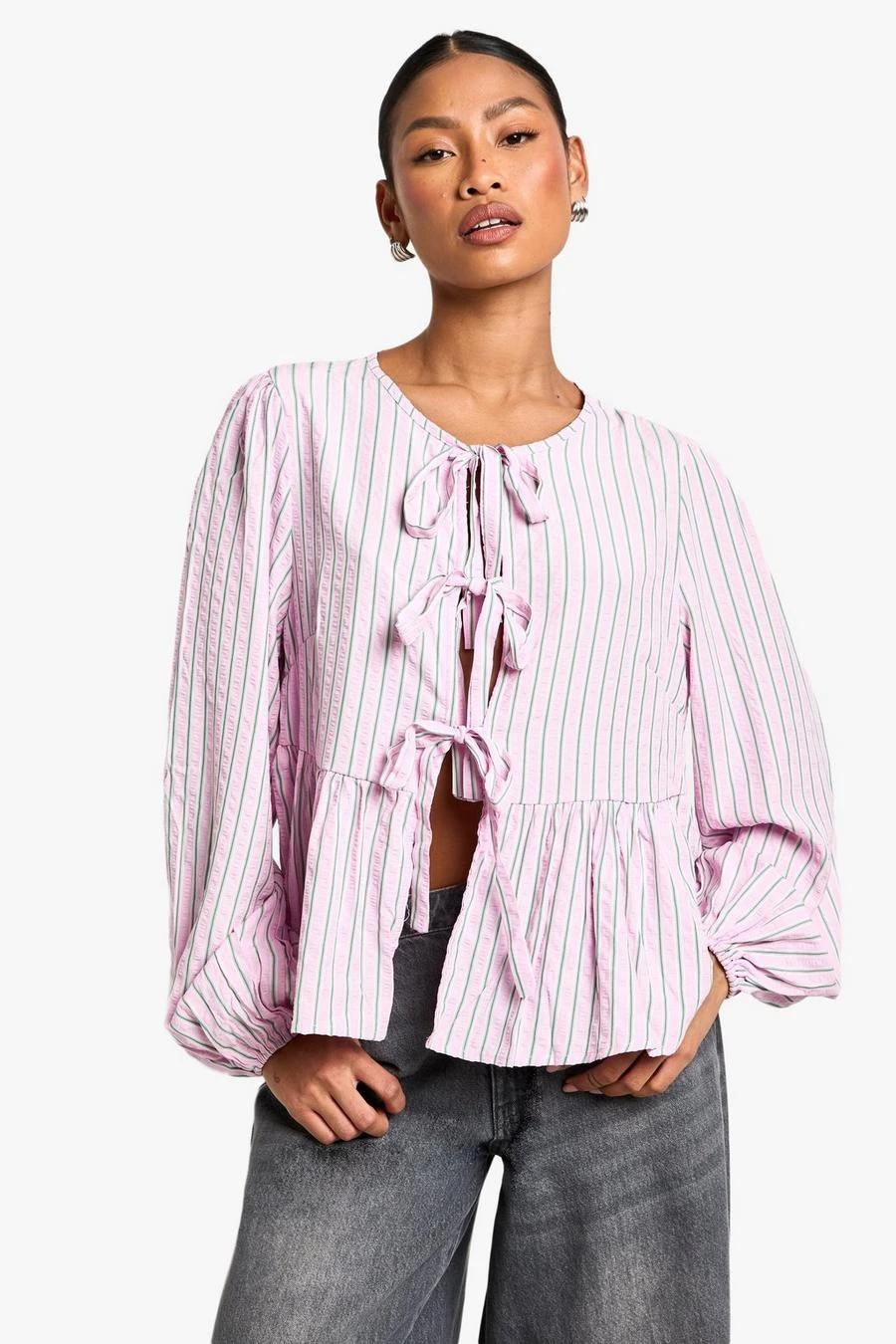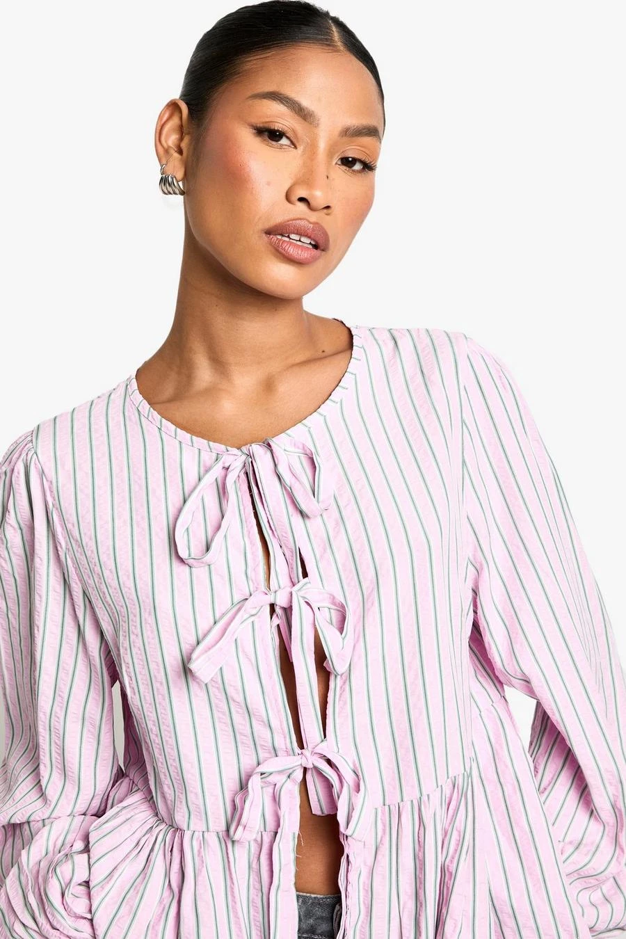BOOHOO Pink And Green Stripe Tie Front Puff Long Sleeve Smock Top