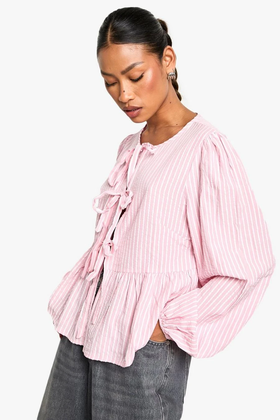 BOOHOO Pink Stripe Tie Front Puff Long Sleeve Smock Top