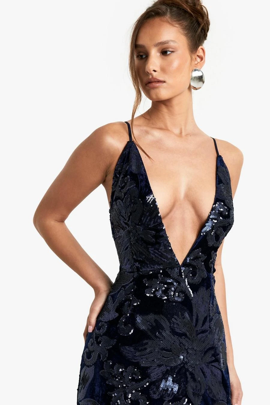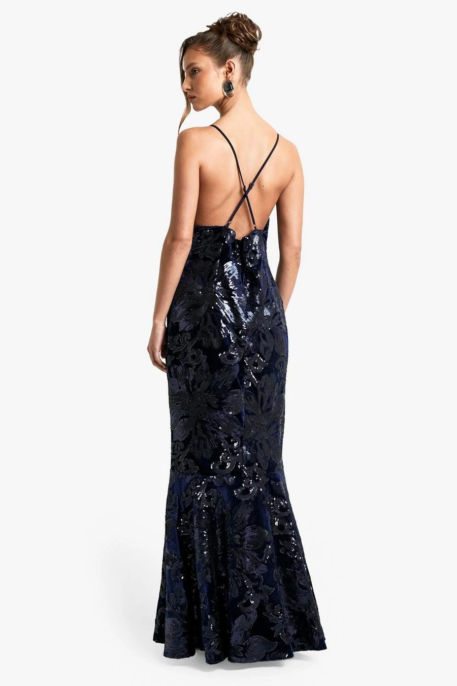 BOOHOO Plunge Strappy Demask Sequin Maxi Dress