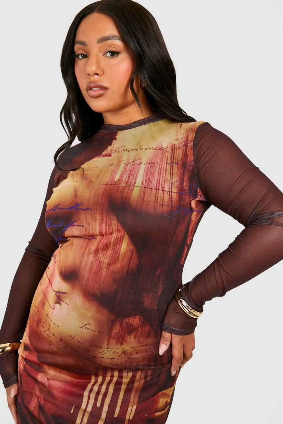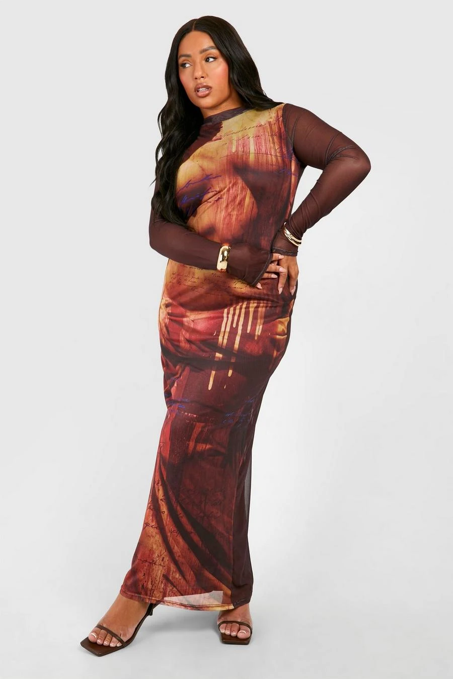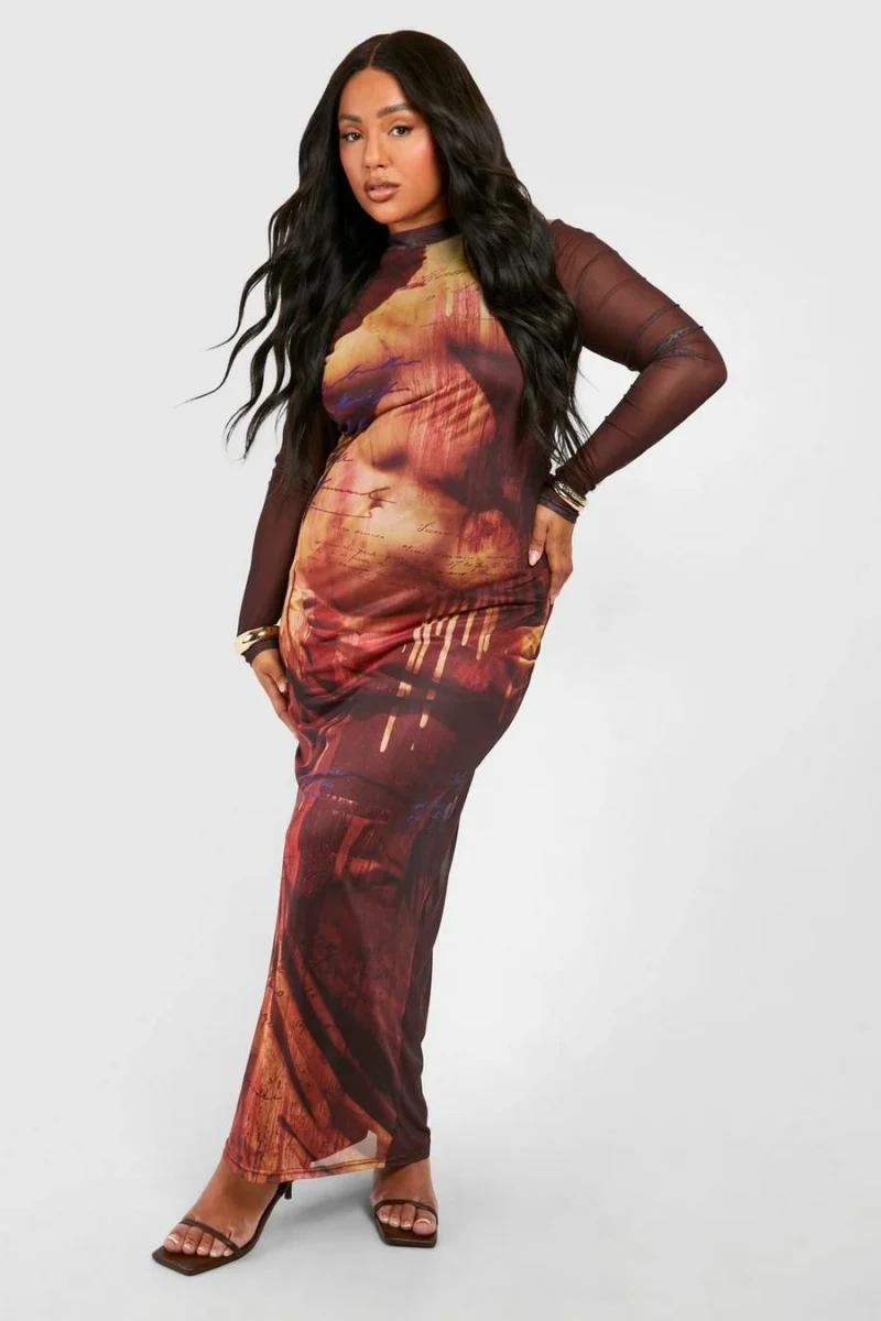 BOOHOO Plus Body Print Mesh Long Sleeve Maxi Dress