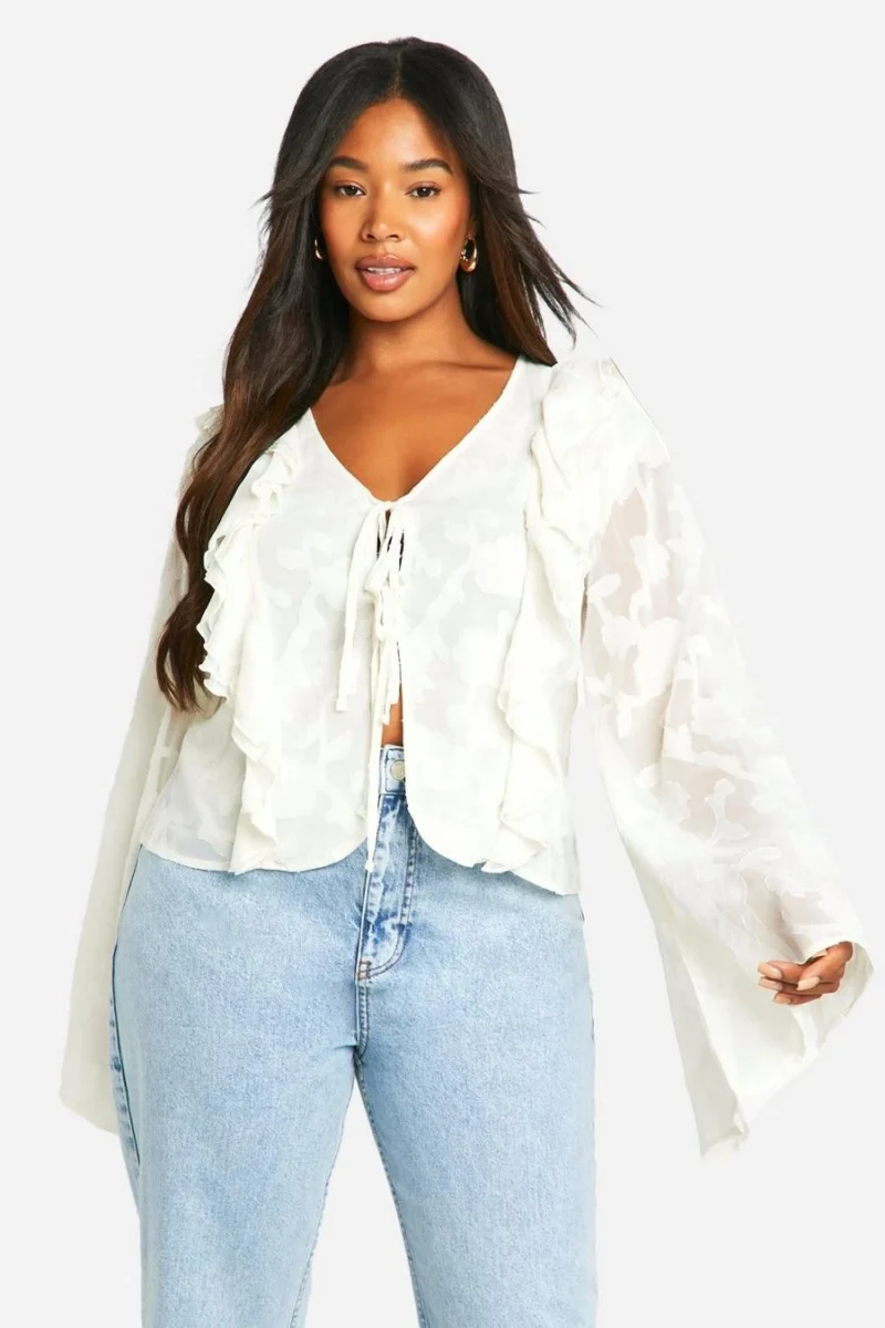 BOOHOO Plus Burnout Floral Tie Front Ruffle Blouse