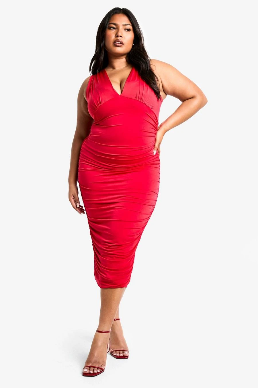 BOOHOO Plus Double Slinky Plunge Ruched Midi Dress