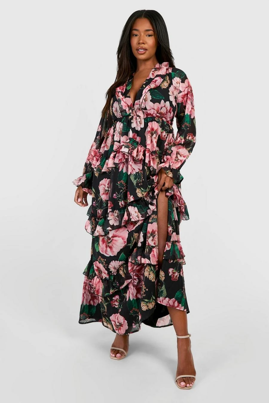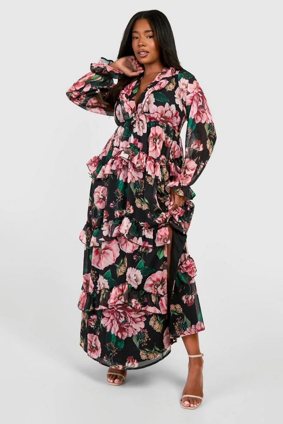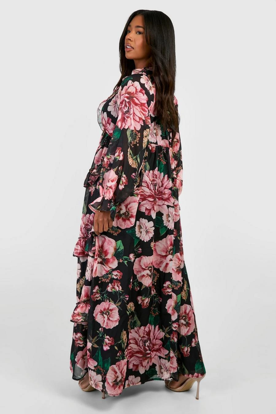 BOOHOO Plus Floral Chiffon Ruffle Maxi Dress