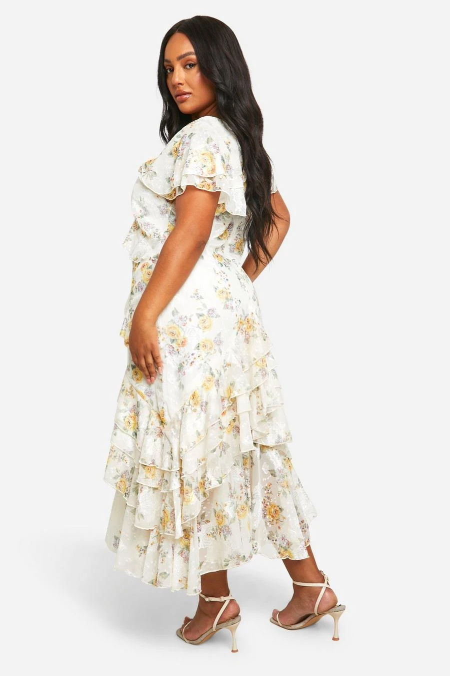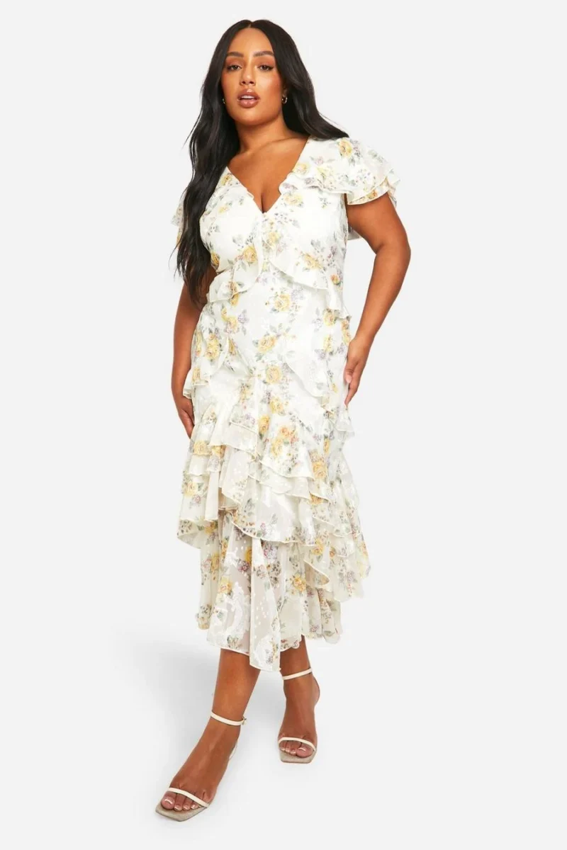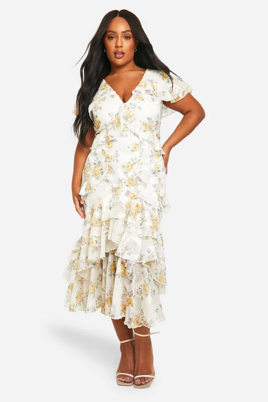 BOOHOO Plus Floral Dobby Ruffle Maxi Dress