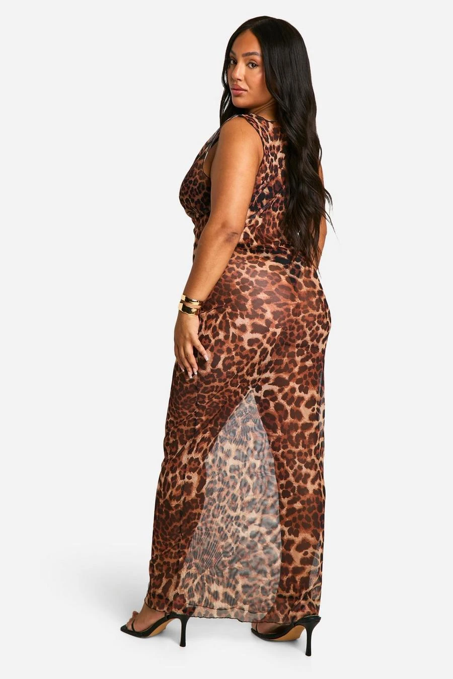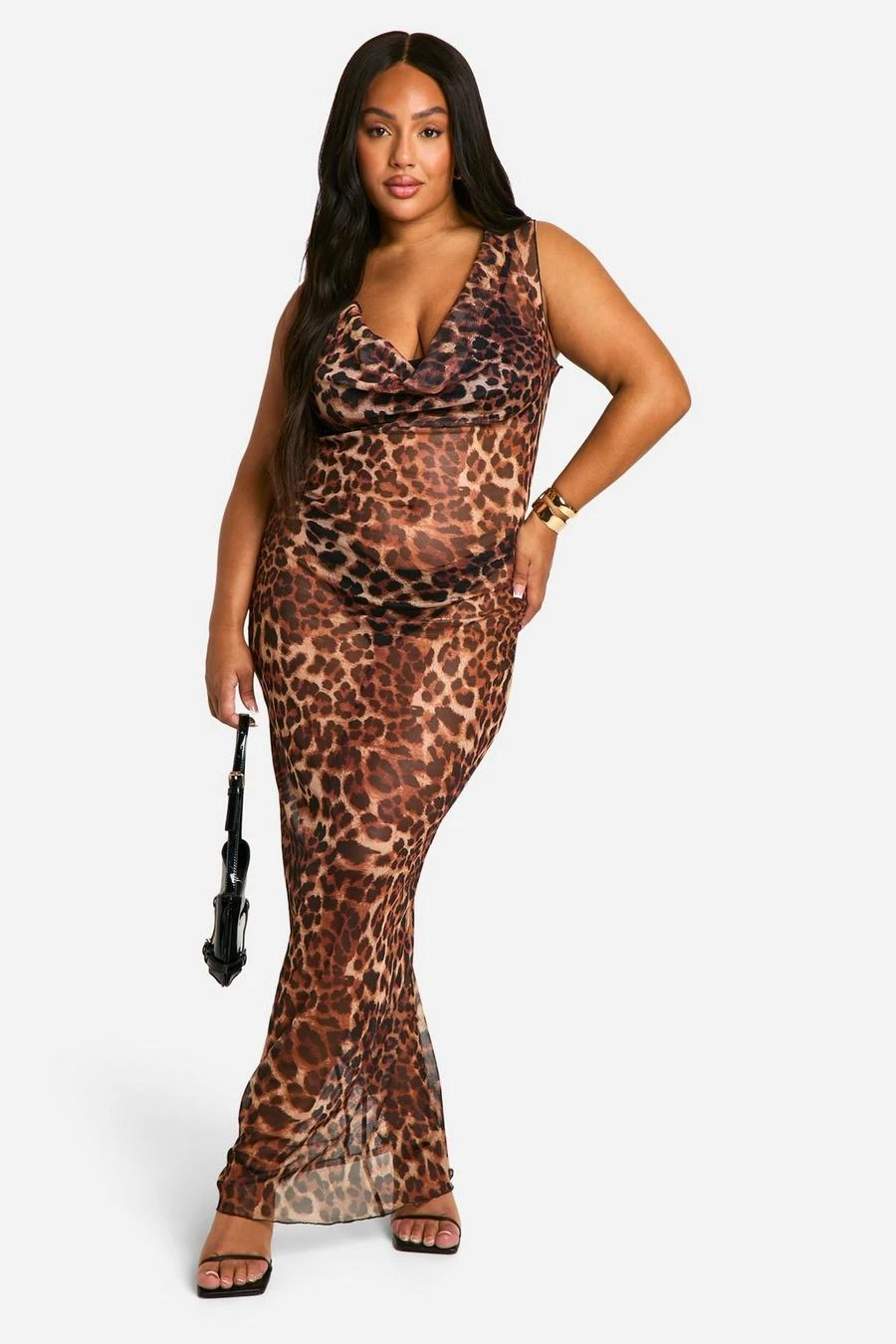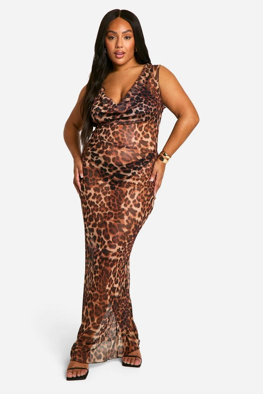 BOOHOO Plus Leopard Mesh Cowl Neck Maxi Dress