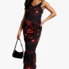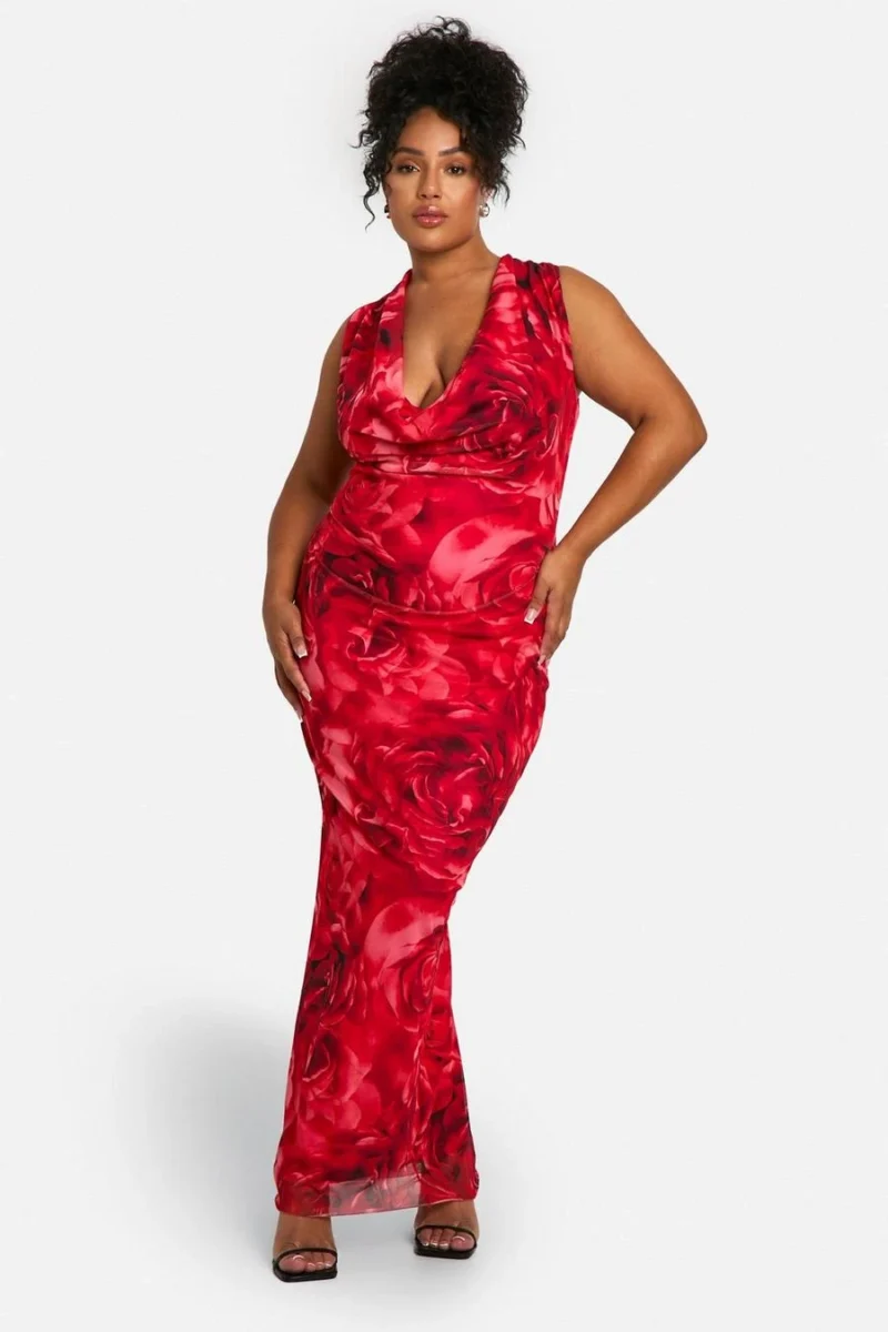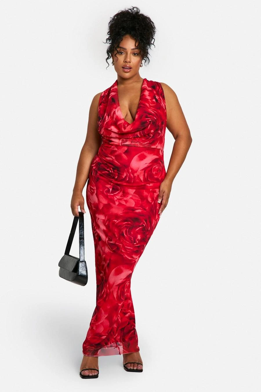 BOOHOO Plus Rose Printed Mesh Deep Cowl Maxi Dress