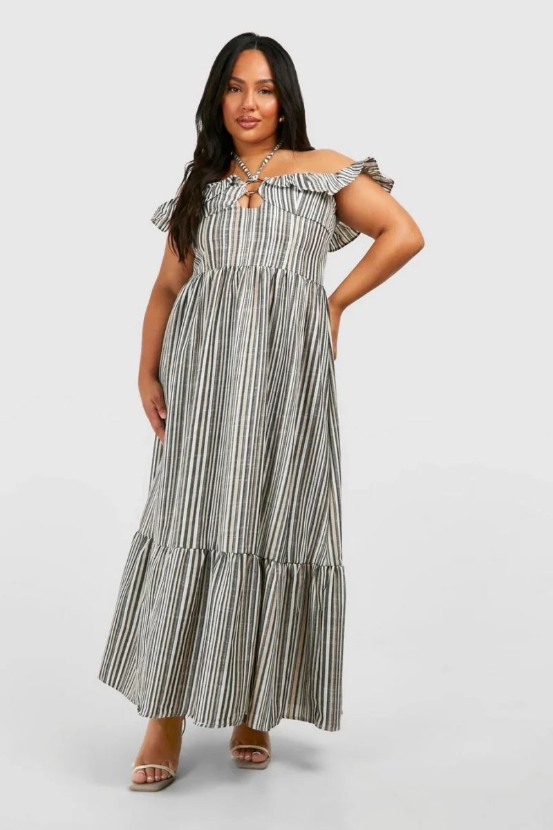 BOOHOO Plus Stripe Halterneck Tiered Maxi Dress