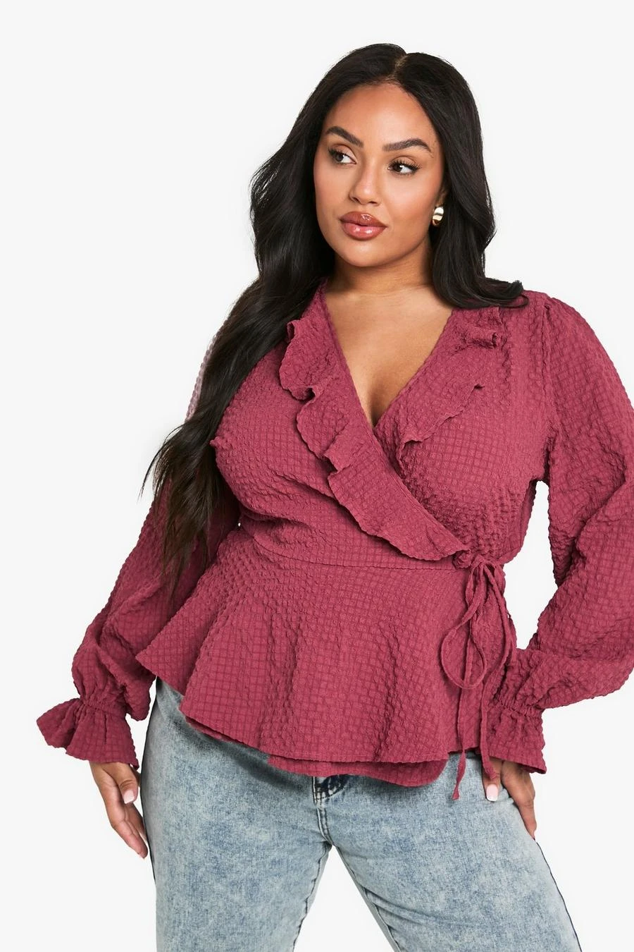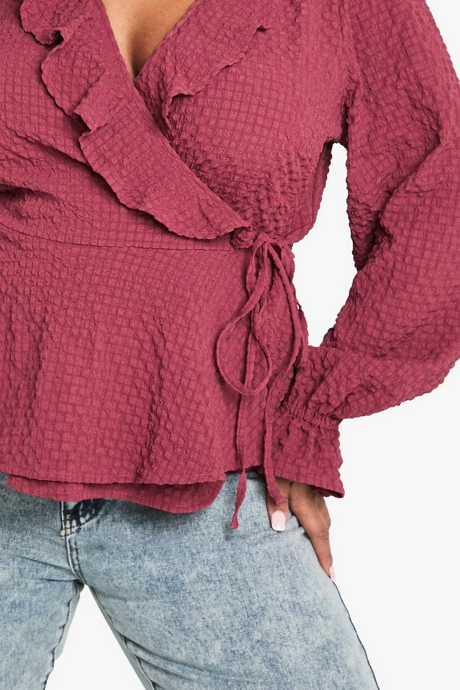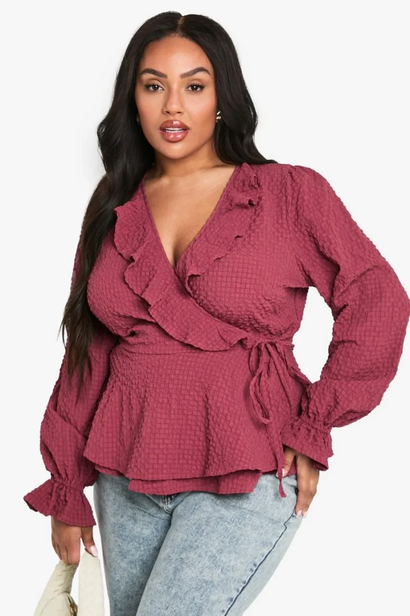 BOOHOO Plus Textured Tie Detail WRAP RUFFLE Blouse