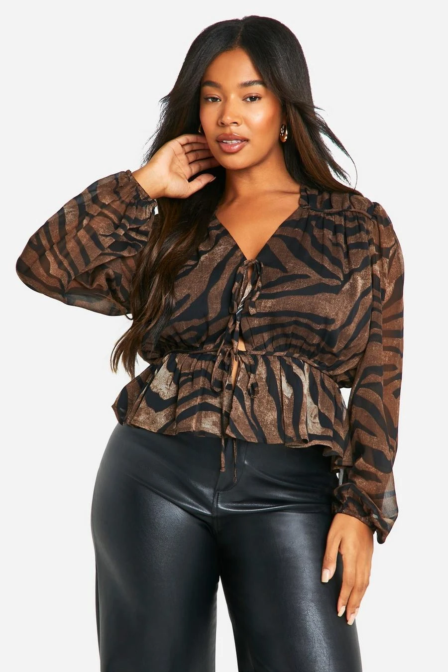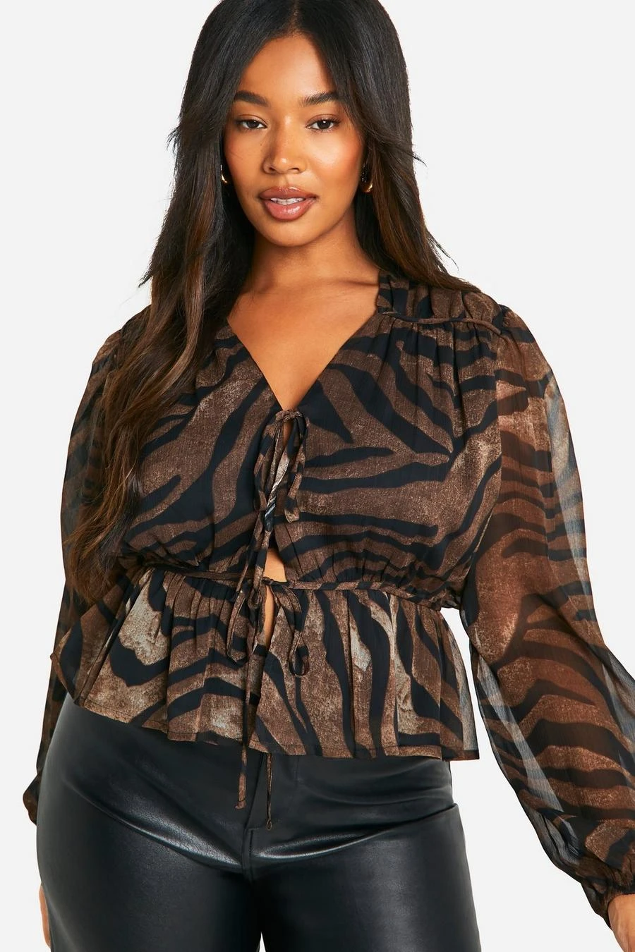 BOOHOO Plus Tie Front Chiffon Animal Blouse