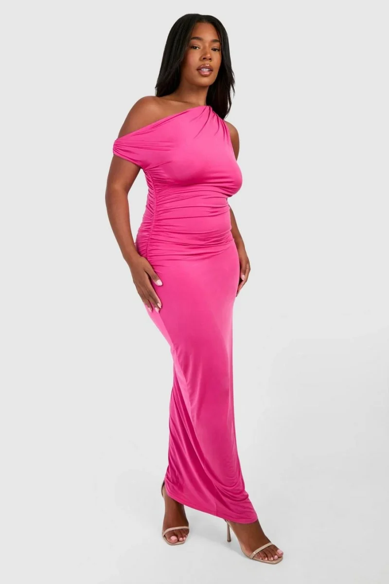 BOOHOO Plus Twisted Ring Detail Off The Shoulder Asymmetric Maxi Dress