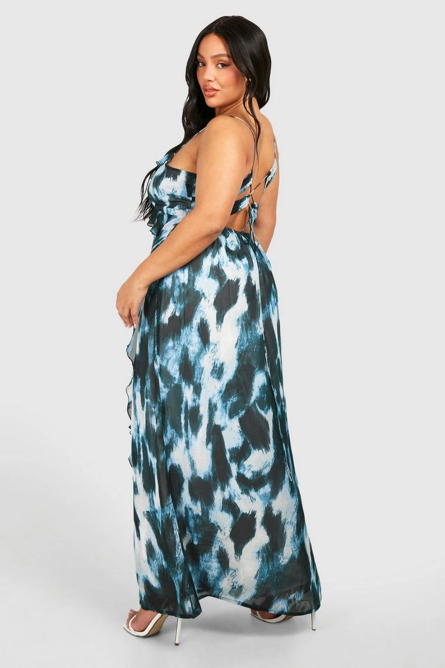 BOOHOO Plus Woven Abstract Print Ruffle Detail Strappy Maxi Dress