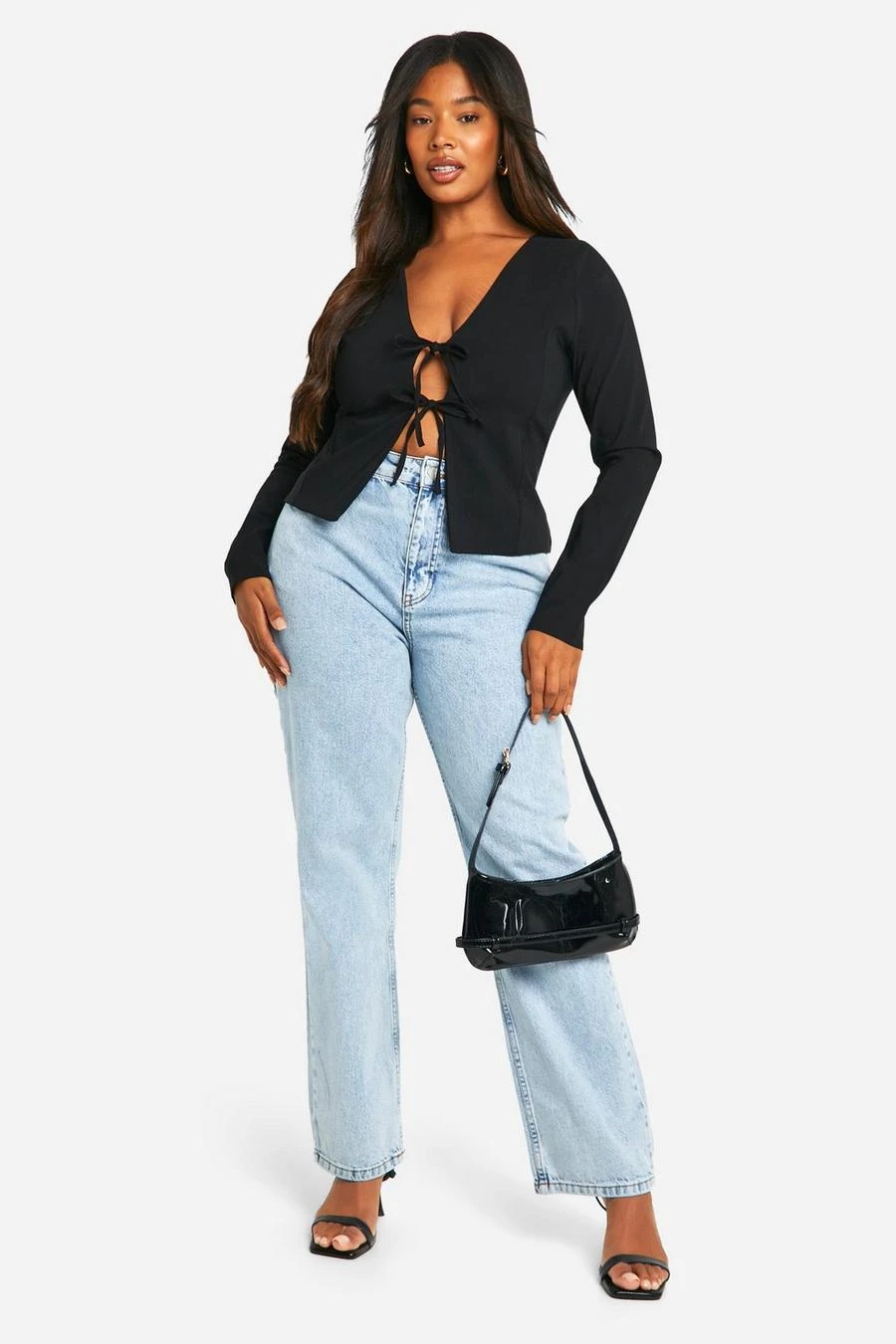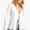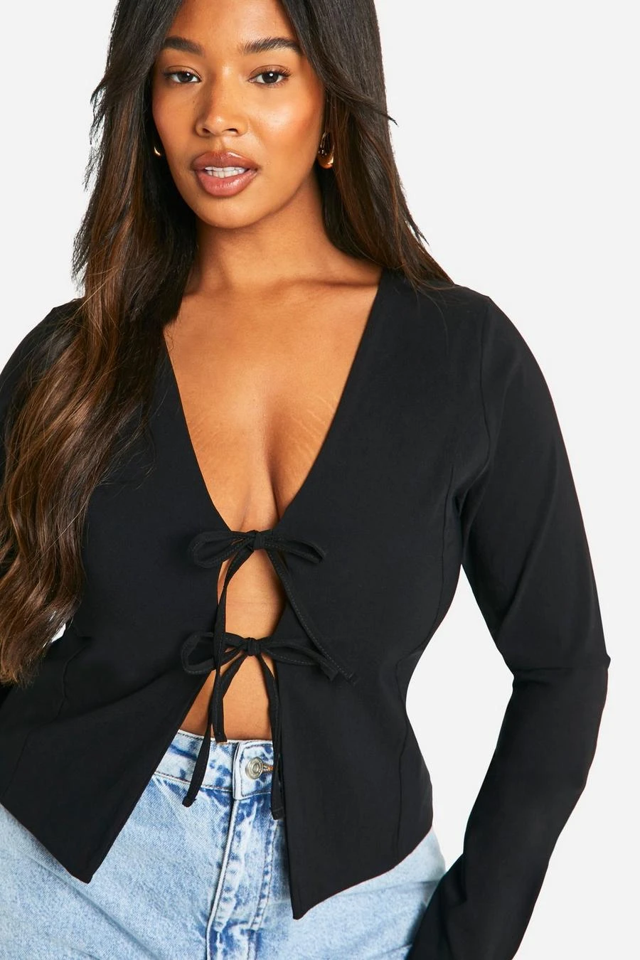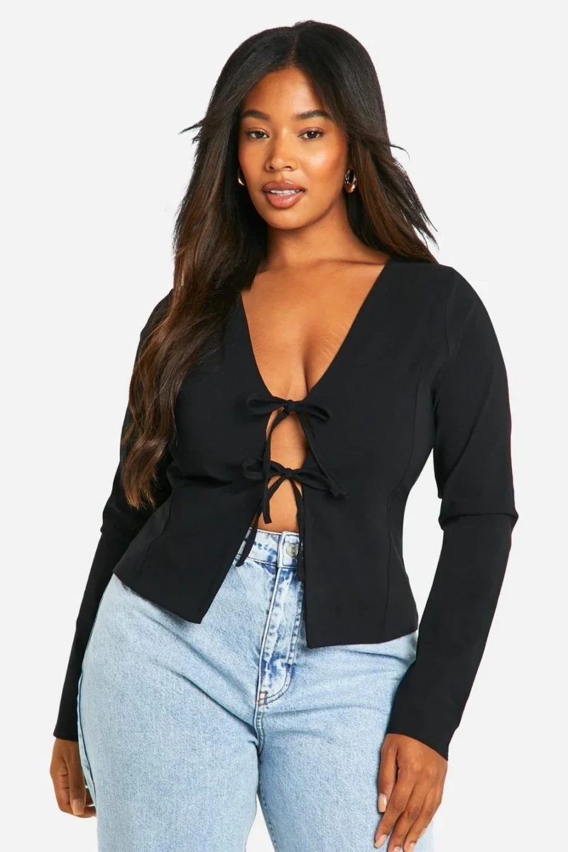 BOOHOO Plus Woven Stretch Tie Detail Long Sleeve Top