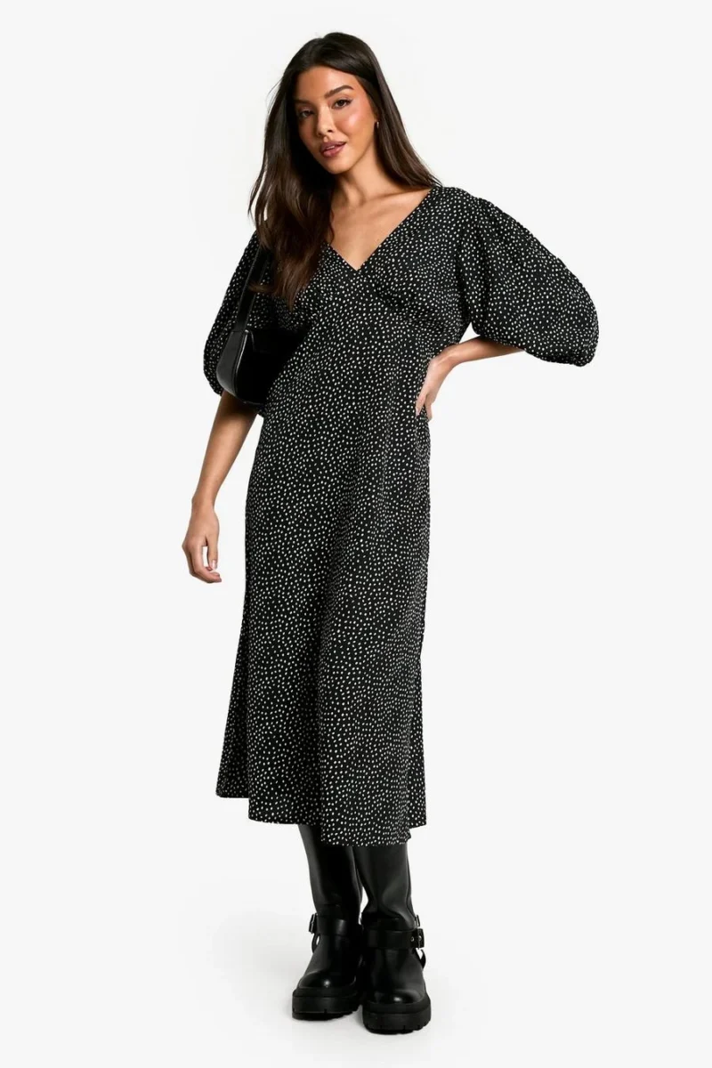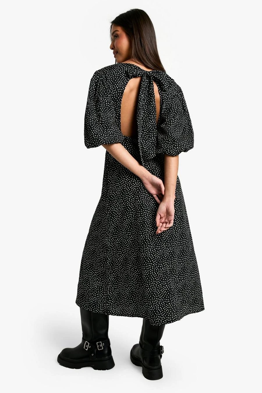 BOOHOO Polka Dot Puff Sleeve Tie Back Midi Dress