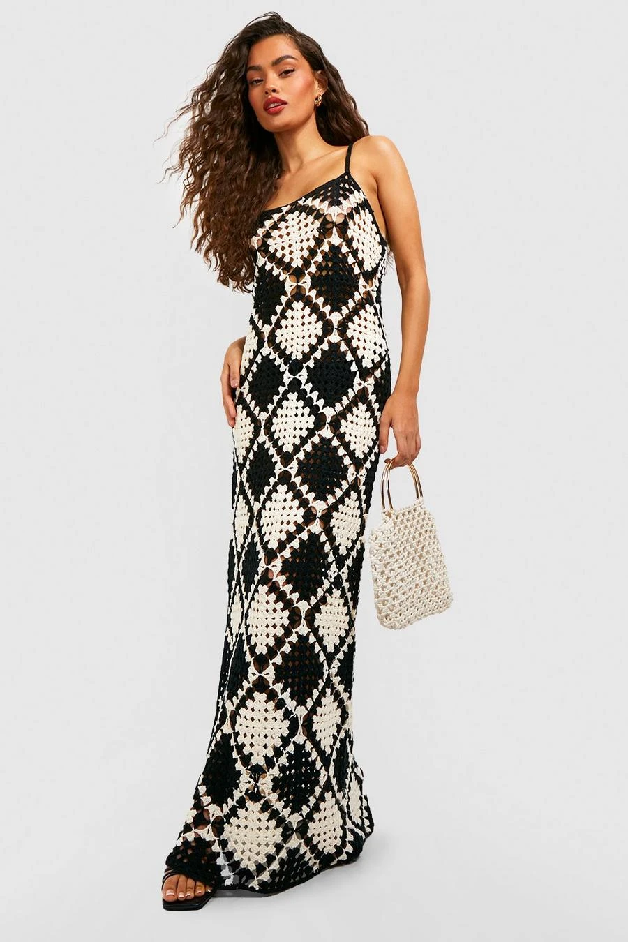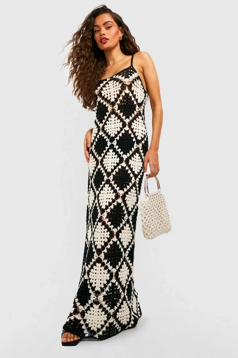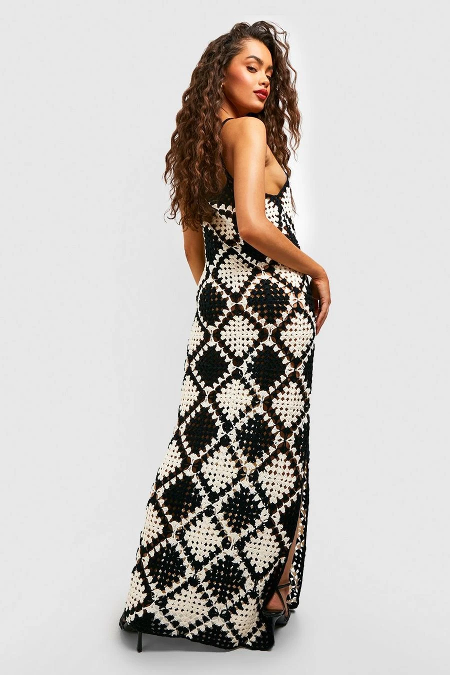 BOOHOO Premium Mono Patchwork Crochet Maxi Dress