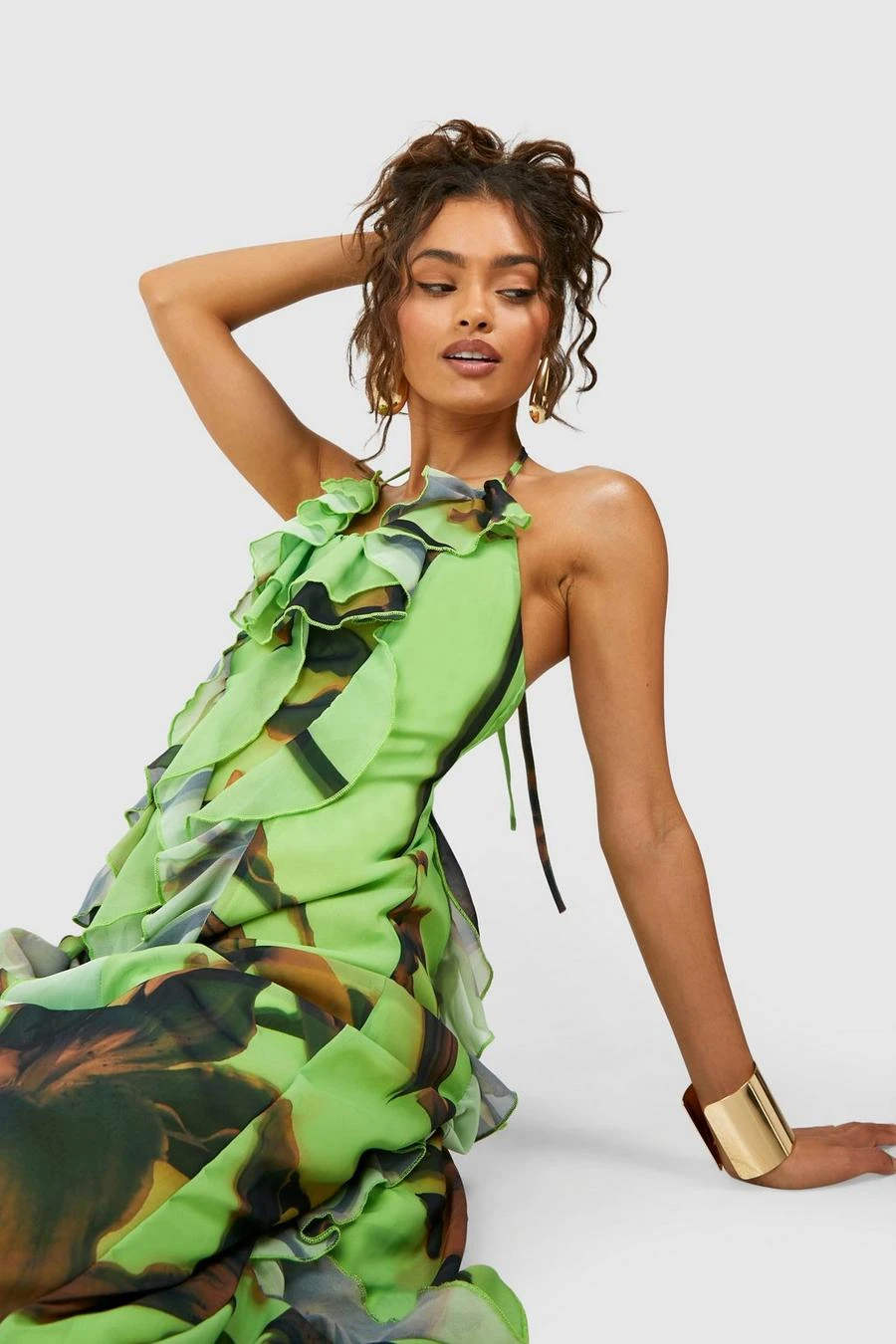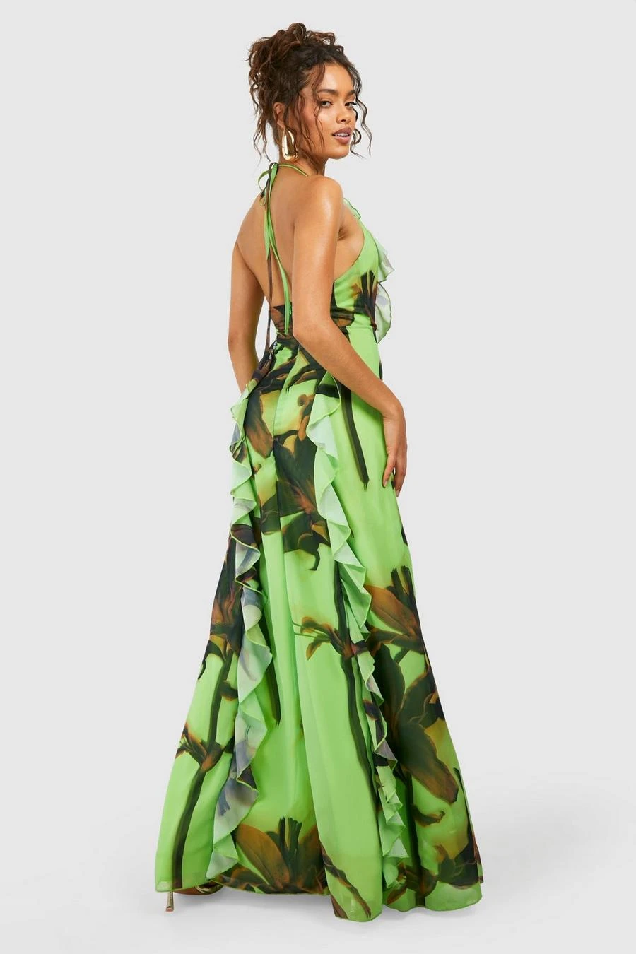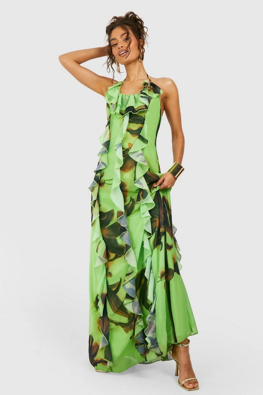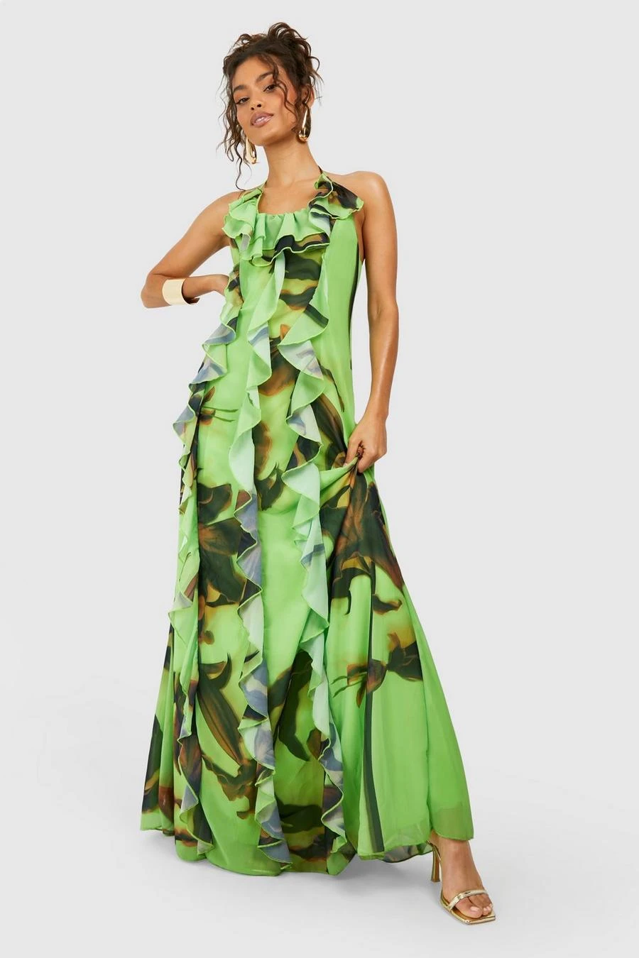 BOOHOO Printed Chiffon Ruffle Maxi Dress
