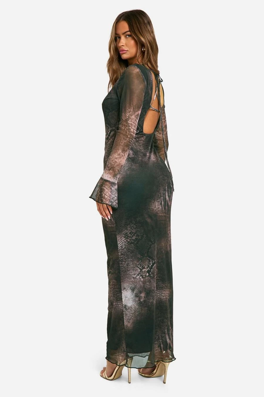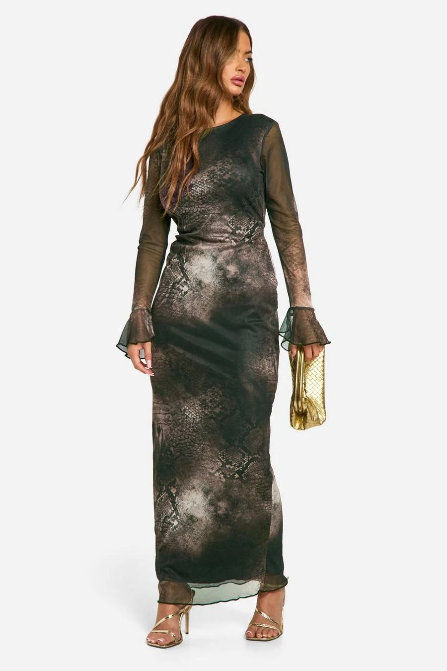BOOHOO Printed Flare Long Sleeve Maxi Dress