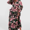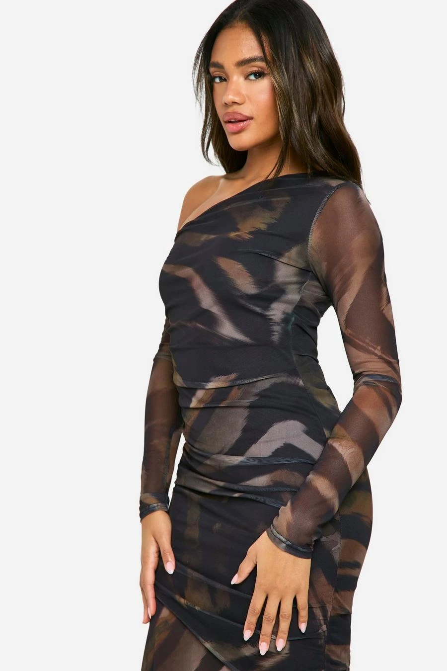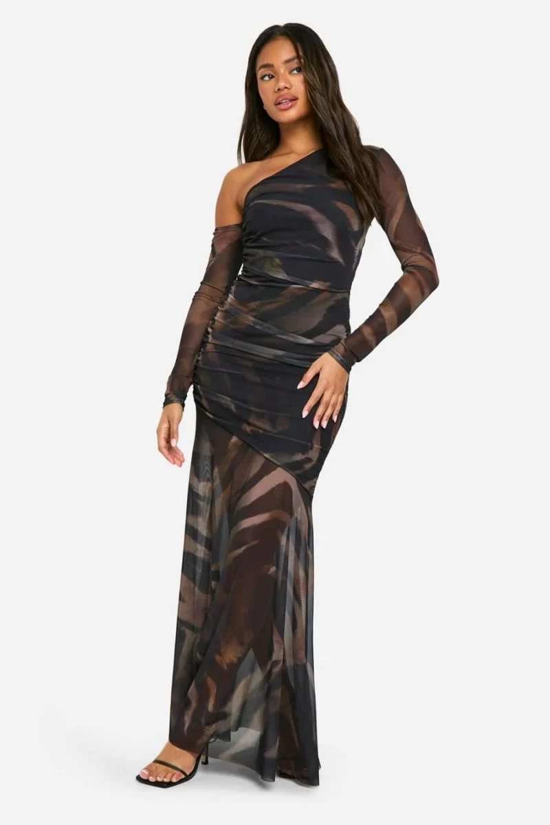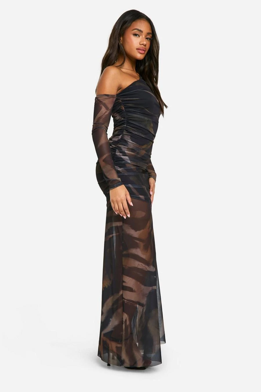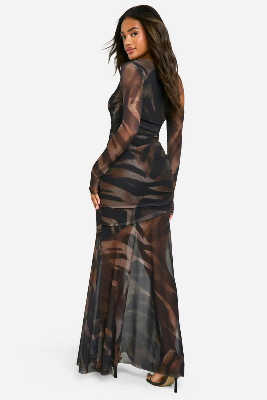 BOOHOO Printed Mesh Asymmetric Long Sleeve Maxi Dress