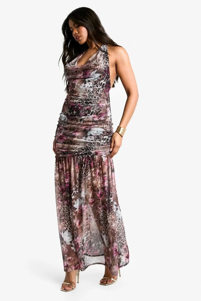 BOOHOO Printed Mesh Halterneck Ruched Maxi Dress