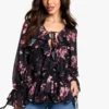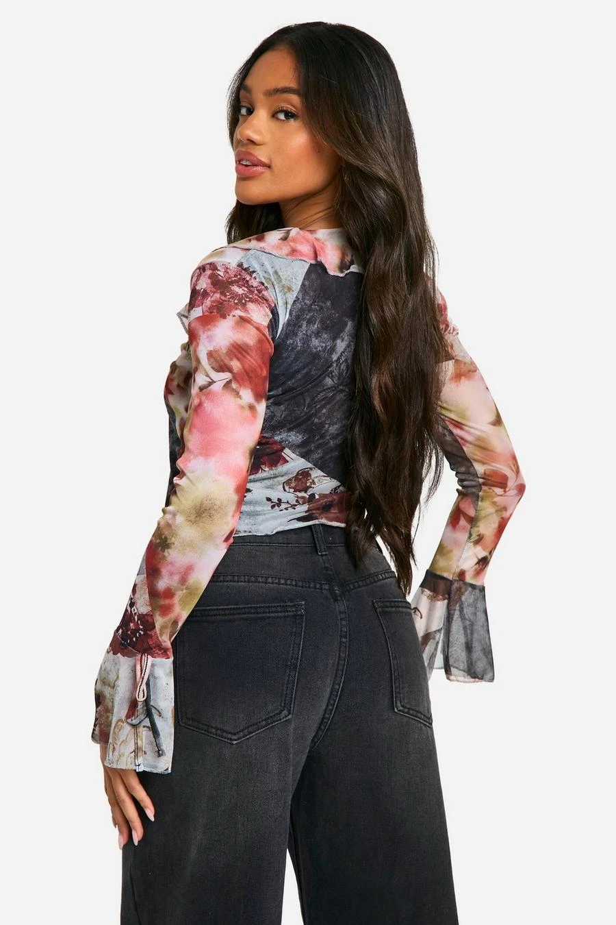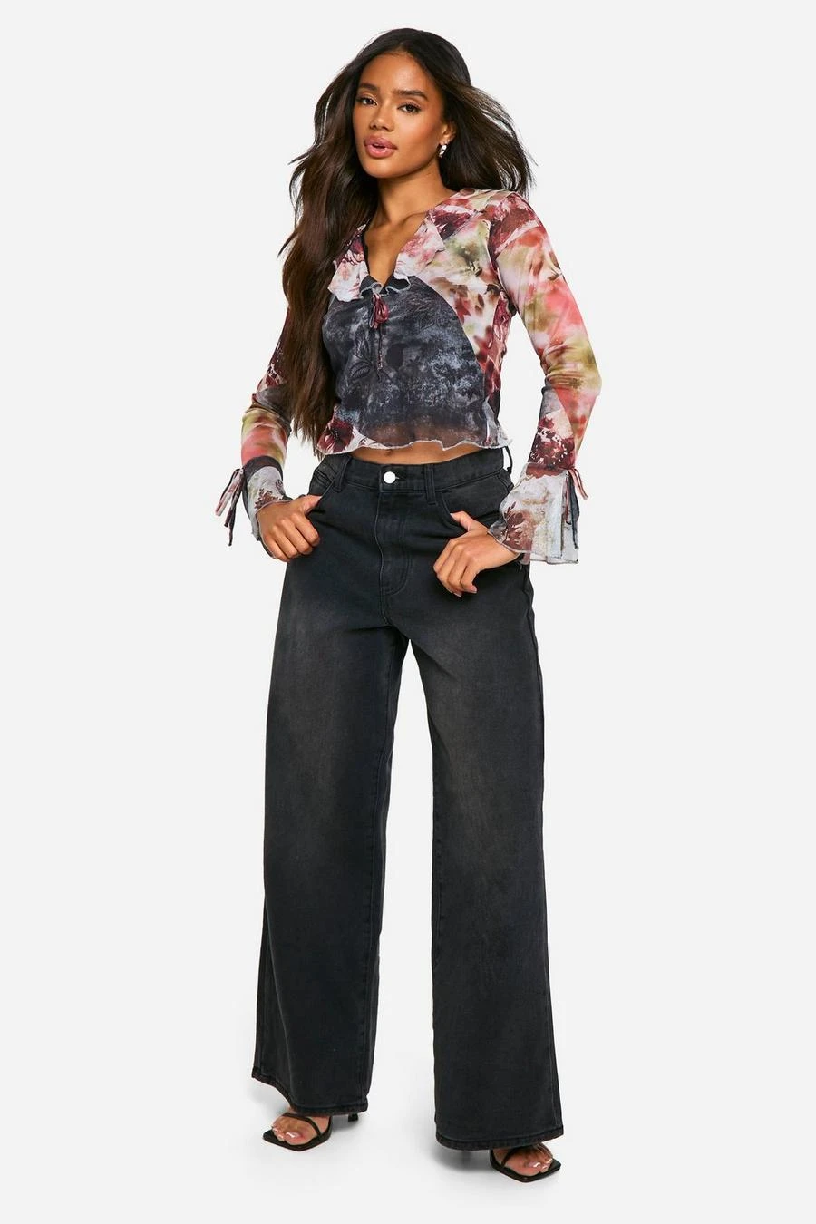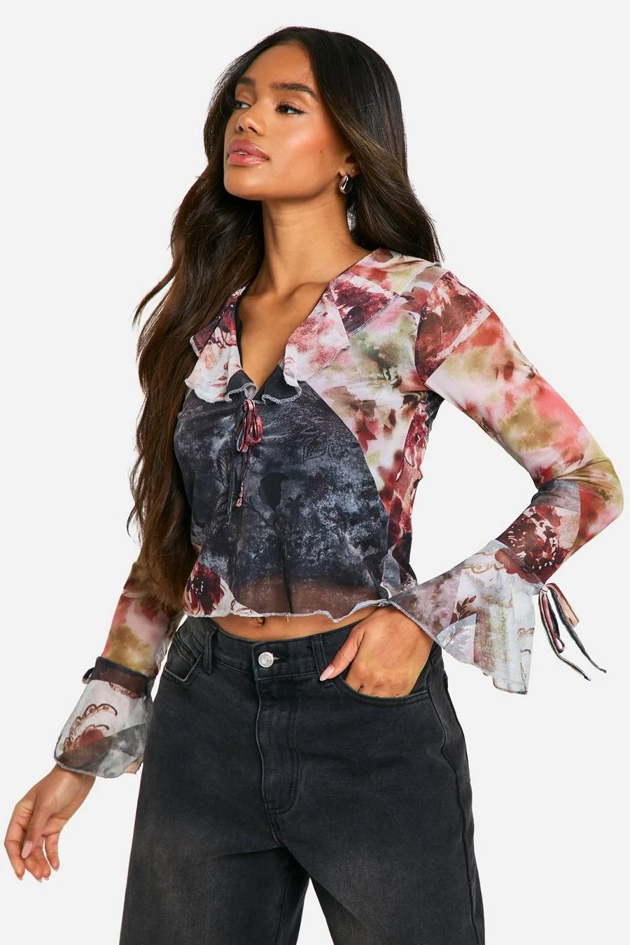 BOOHOO Printed Mesh Tie Front Frill Blouse