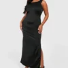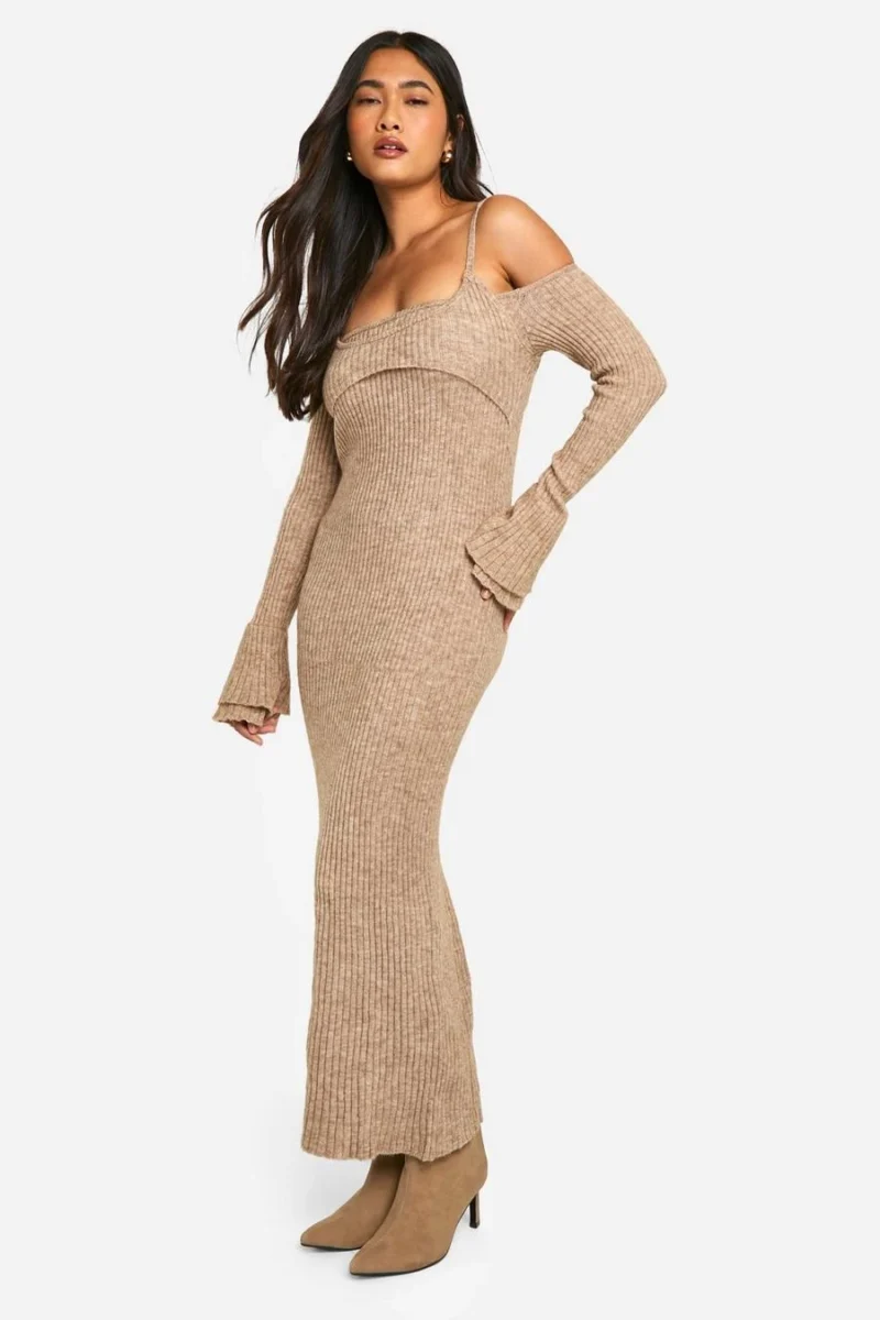 BOOHOO Rib Knit Bardot Halterneck Maxi Dress