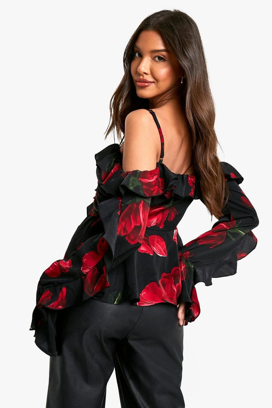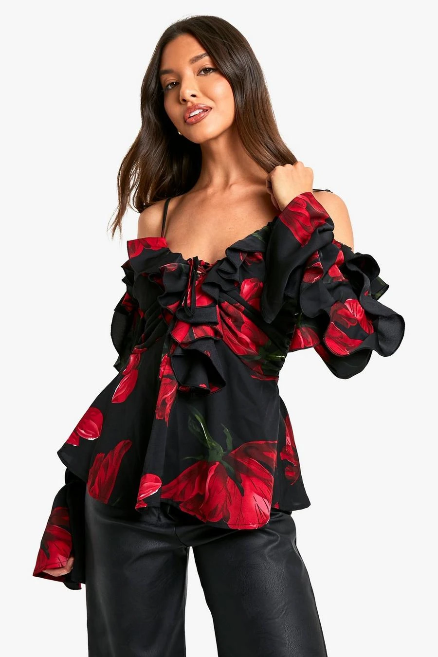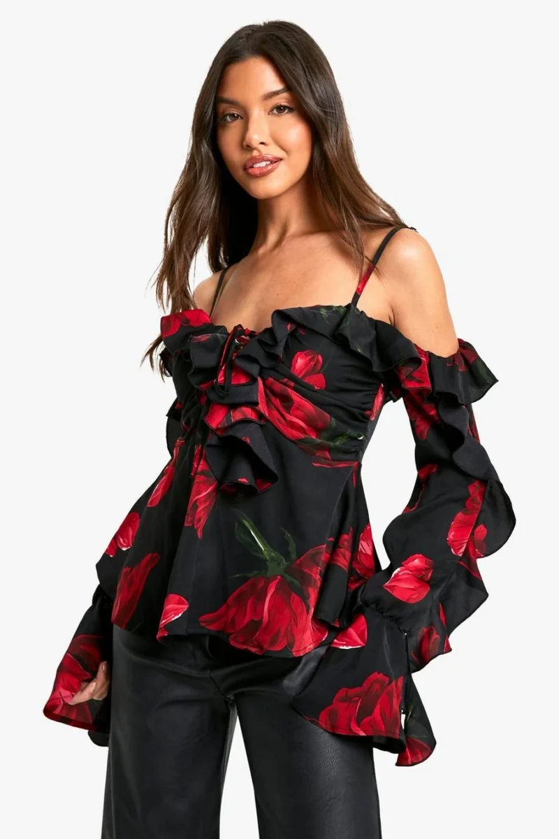 BOOHOO Rose Floral Print Off Shoulder Ruffle Blouse