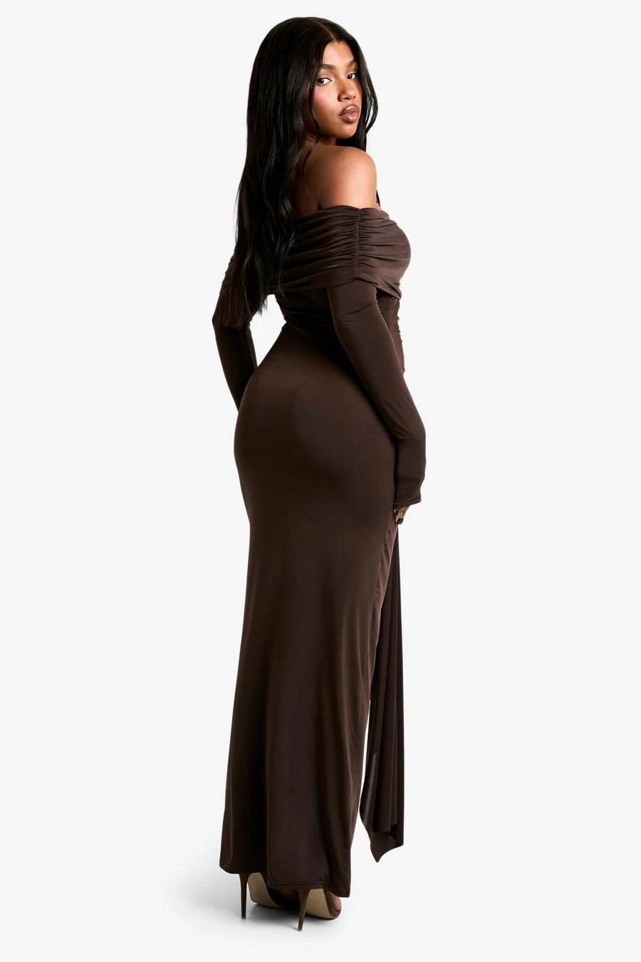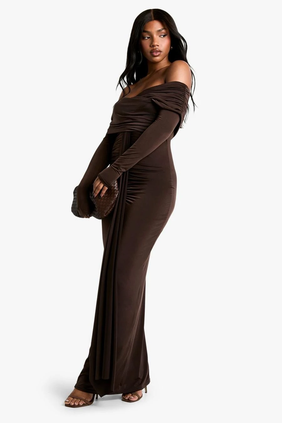 BOOHOO Ruched Bardot Long Sleeve Maxi Dress