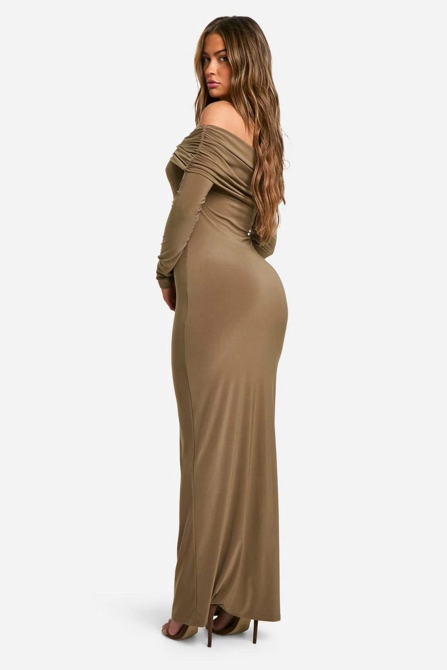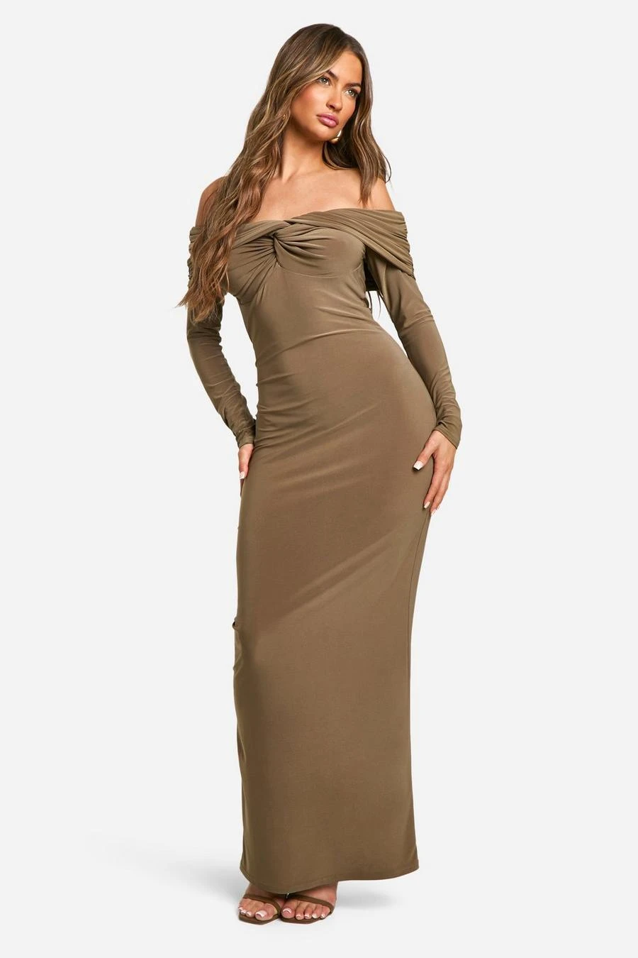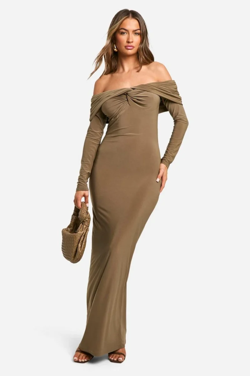BOOHOO Ruched Twist Detail Bardot Maxi Dress
