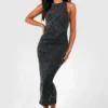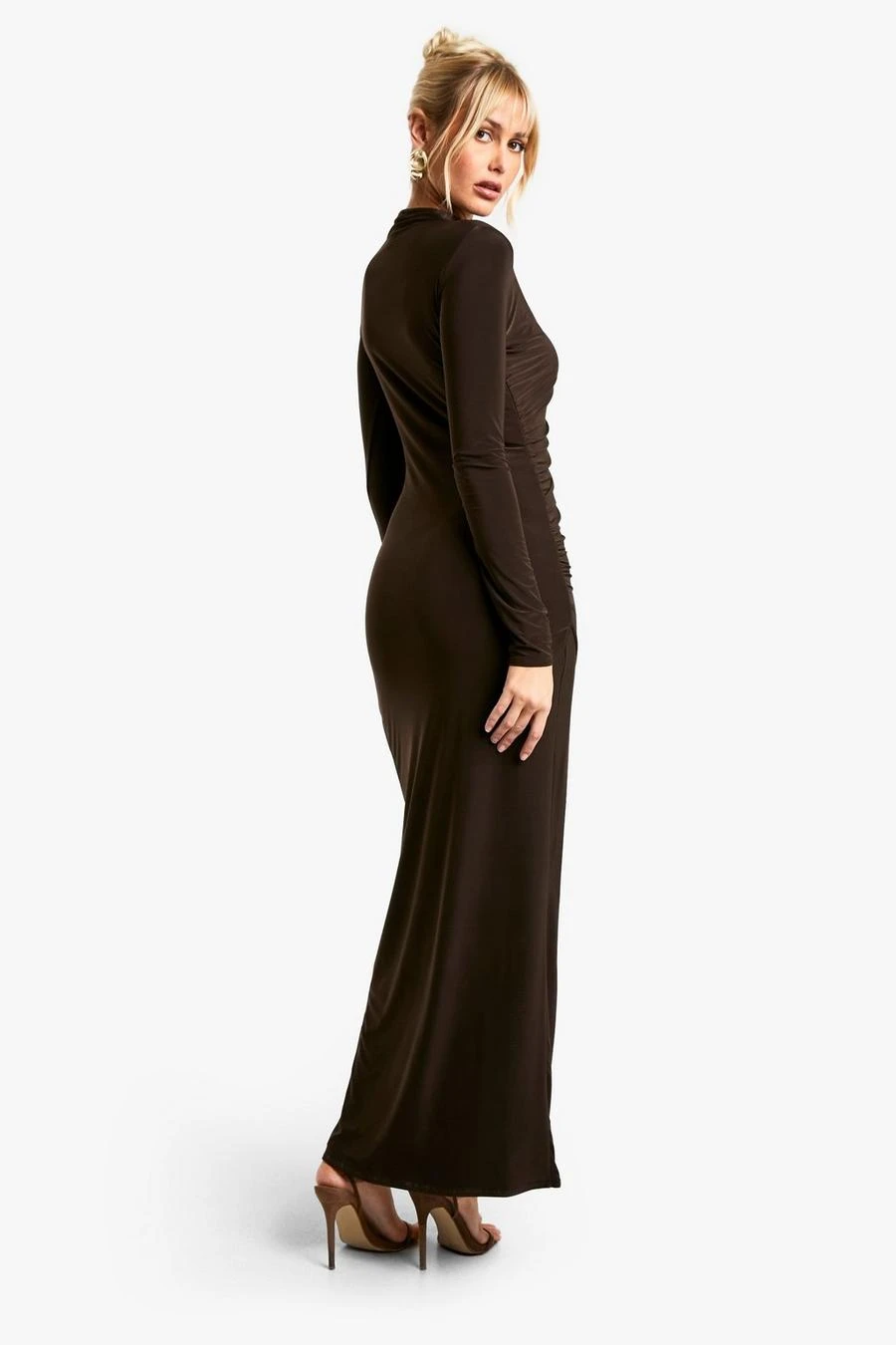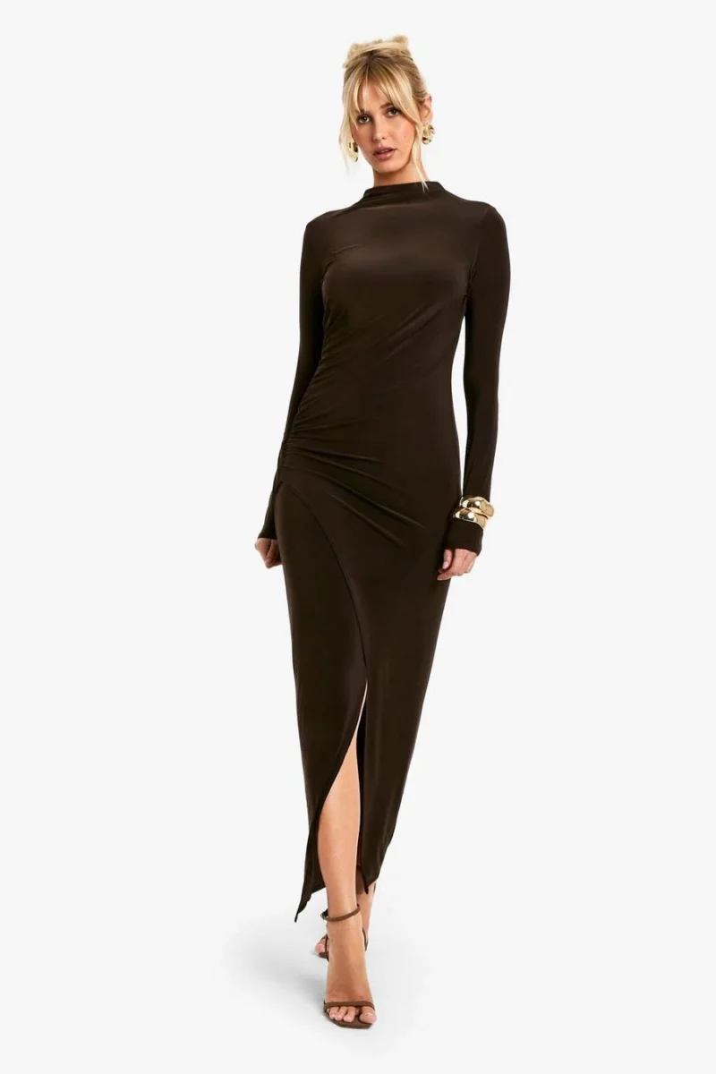 BOOHOO Ruched Waist Long Sleeve Split Maxi Dress