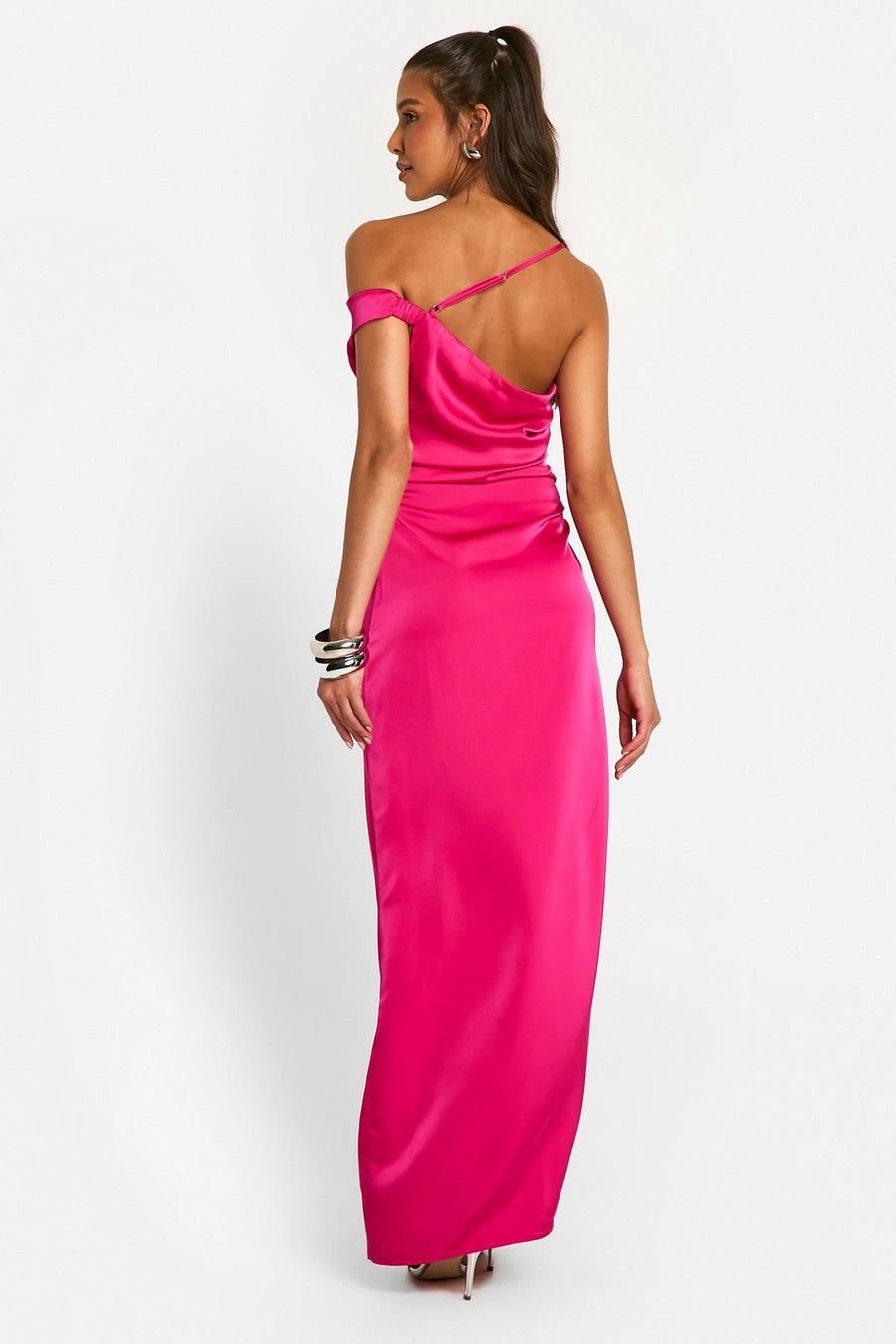 BOOHOO Satin Asymmetric Bardot Maxi Dress