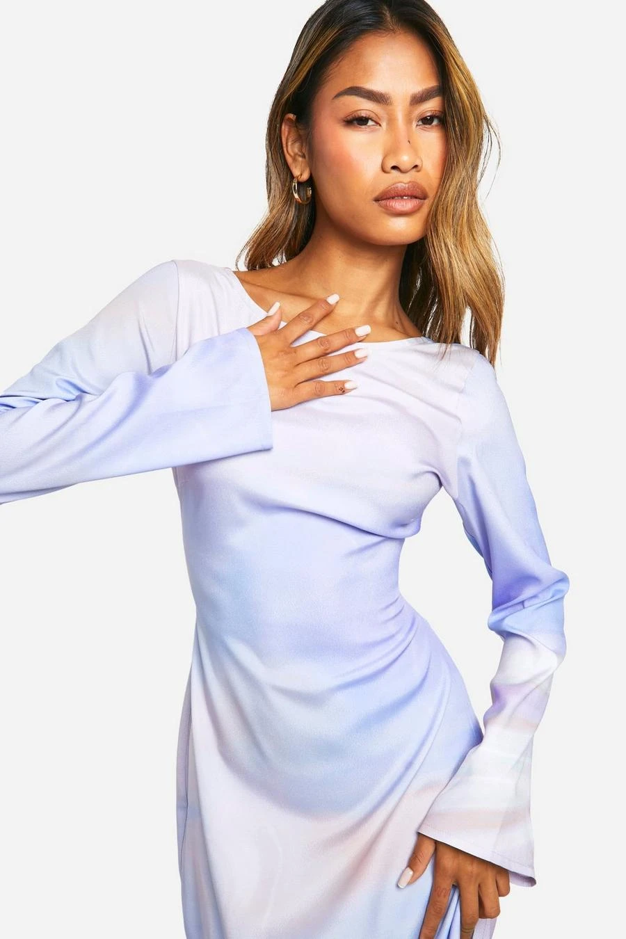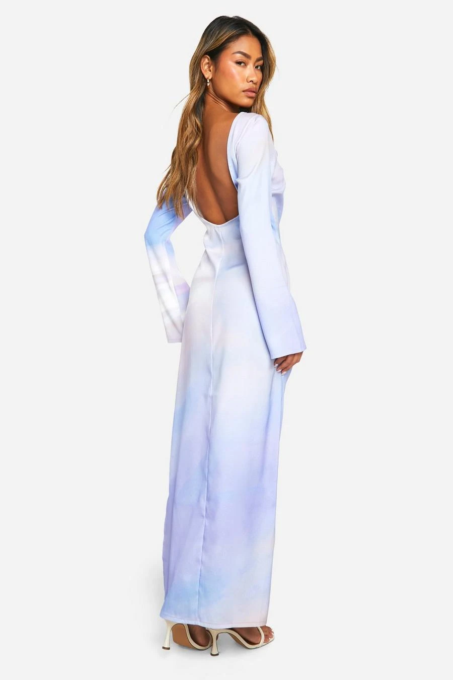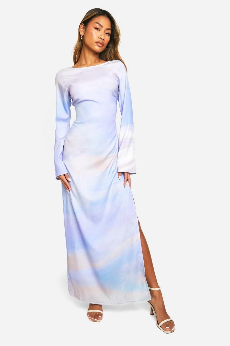 BOOHOO Satin Flare Sleeve Open Back Printed Maxi Dress