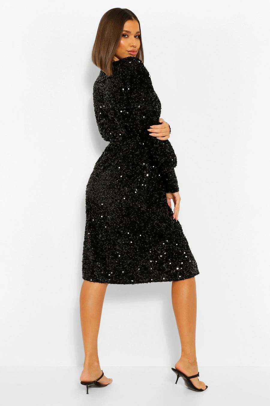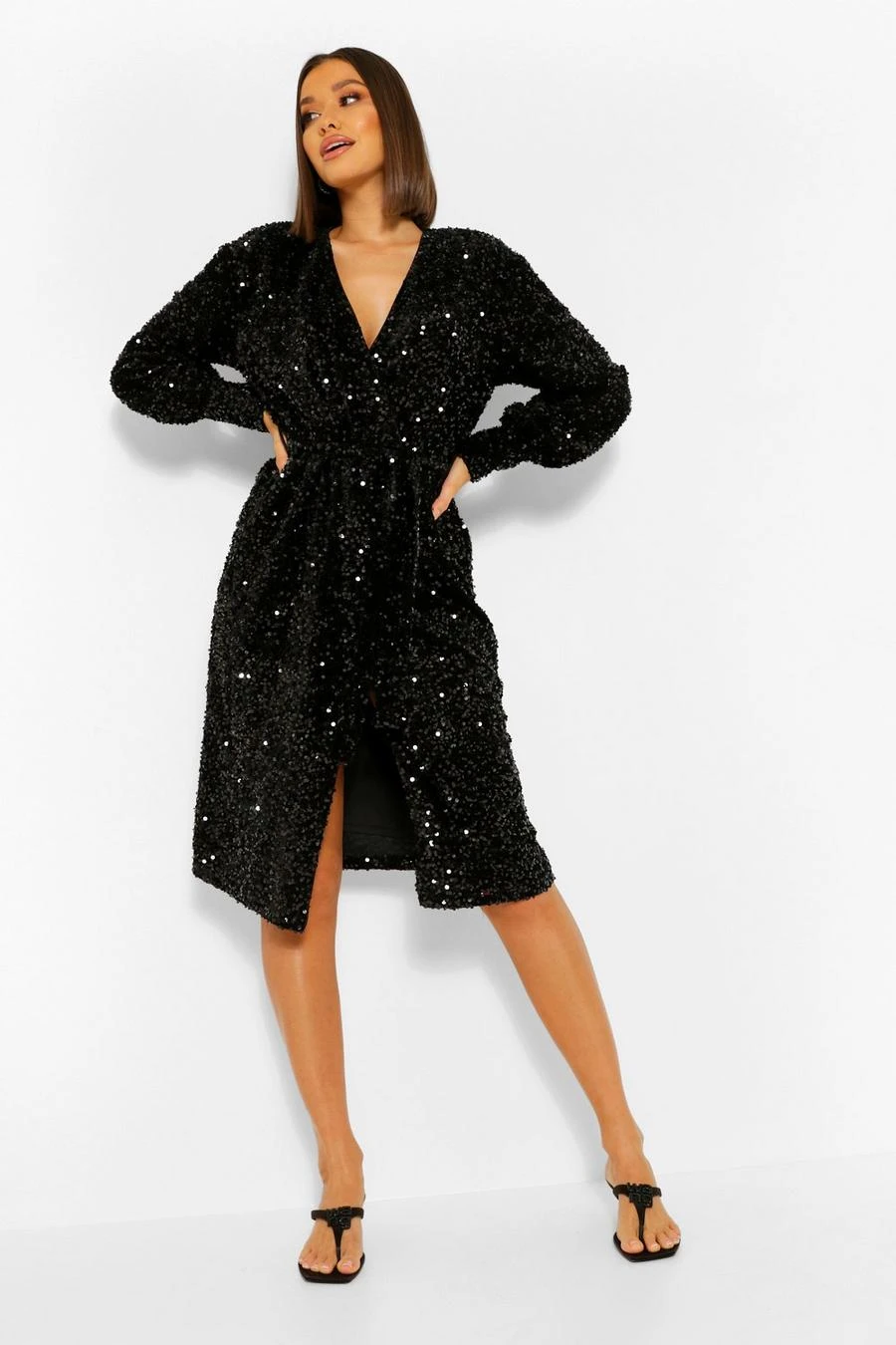 BOOHOO Sequin Long Sleeve Tie Waist Midi Party Dress