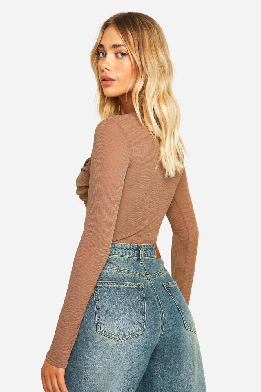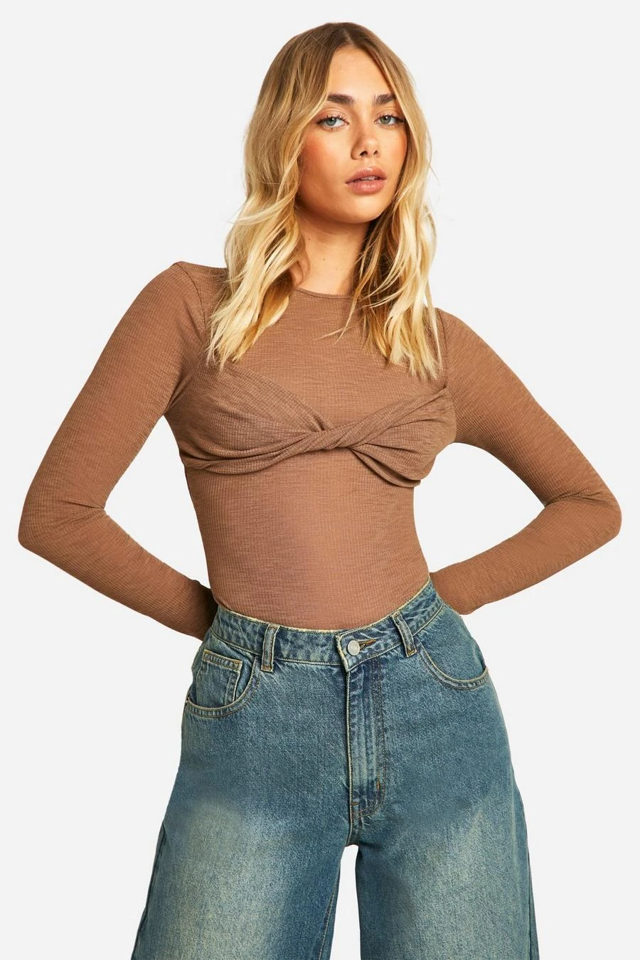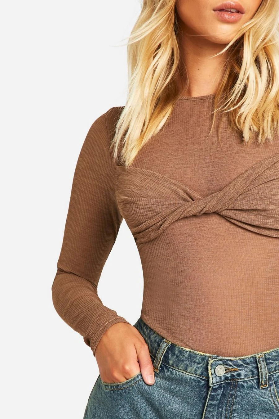 BOOHOO Sheer Rib Twist Front Long Sleeve Top