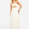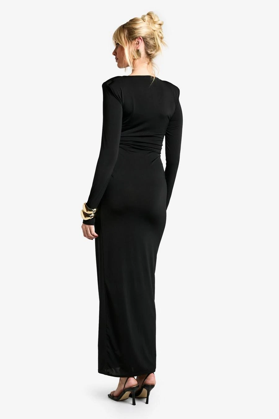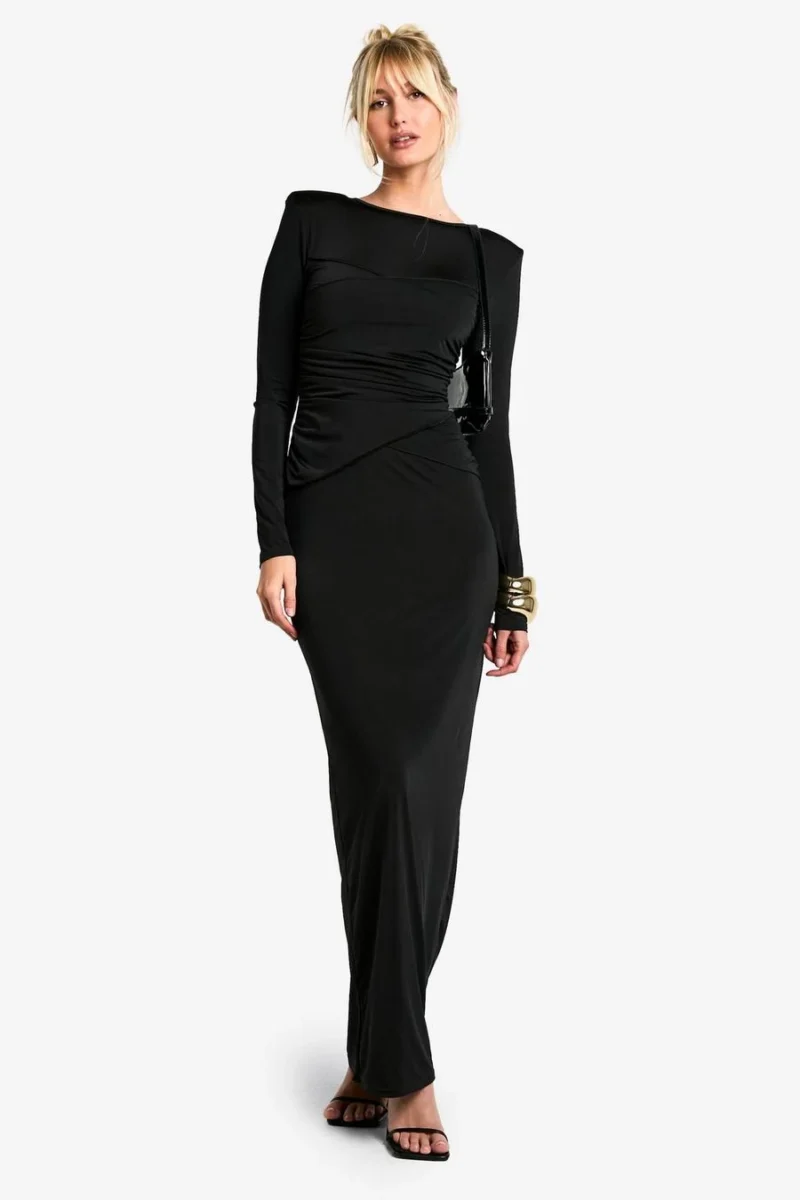 BOOHOO Shoulder Pad Ruched Drape Slinky Maxi Dress