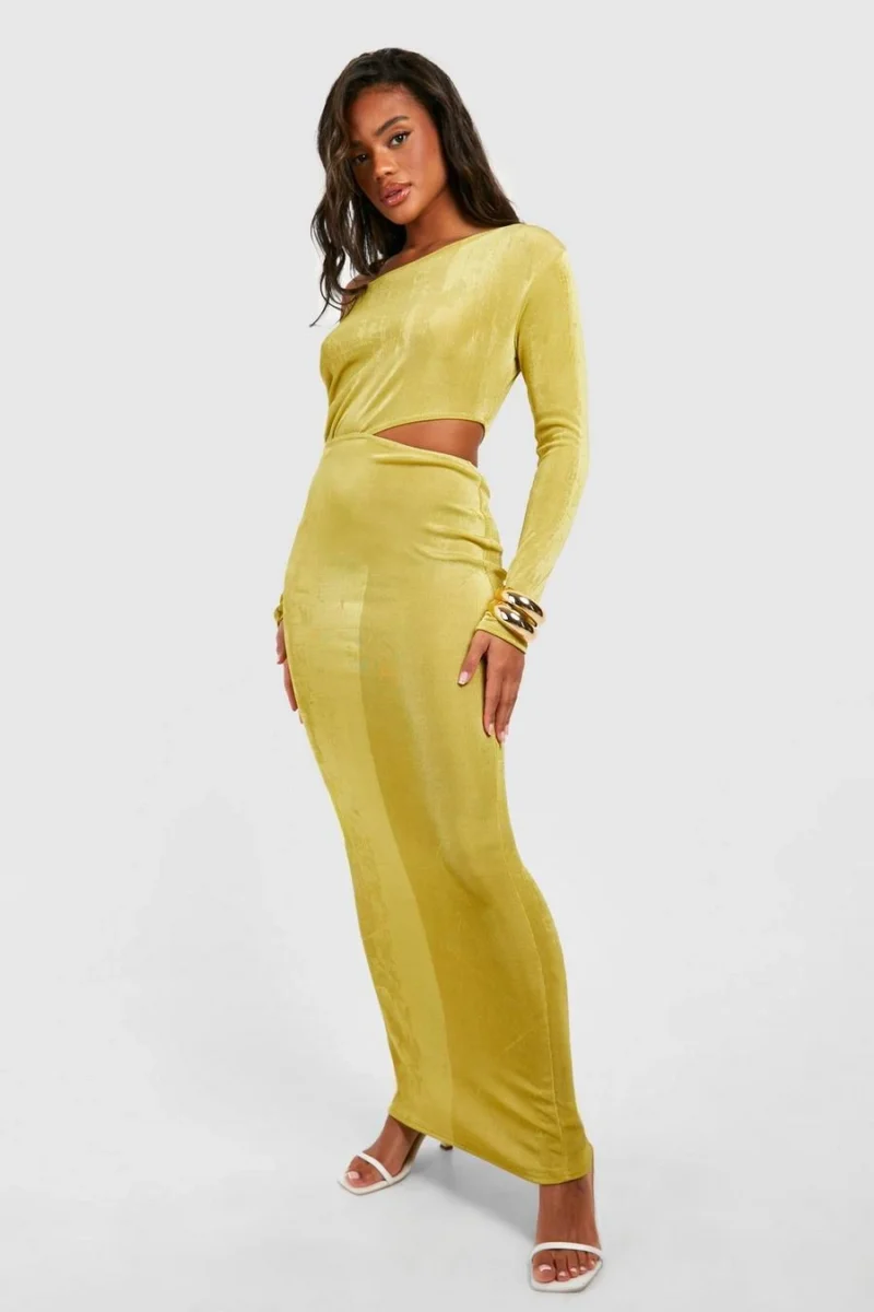 BOOHOO Slash Neck Ruched Acetate Slinky Cut Out Maxi Dress
