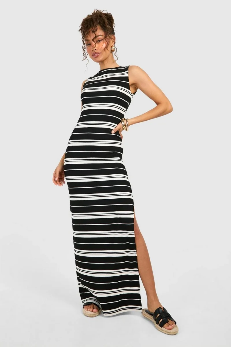BOOHOO Slash Neck Stripe Rib Maxi Dress