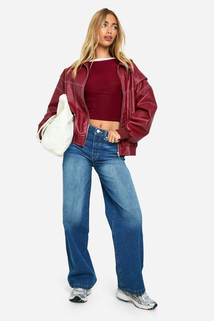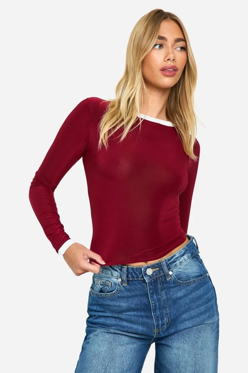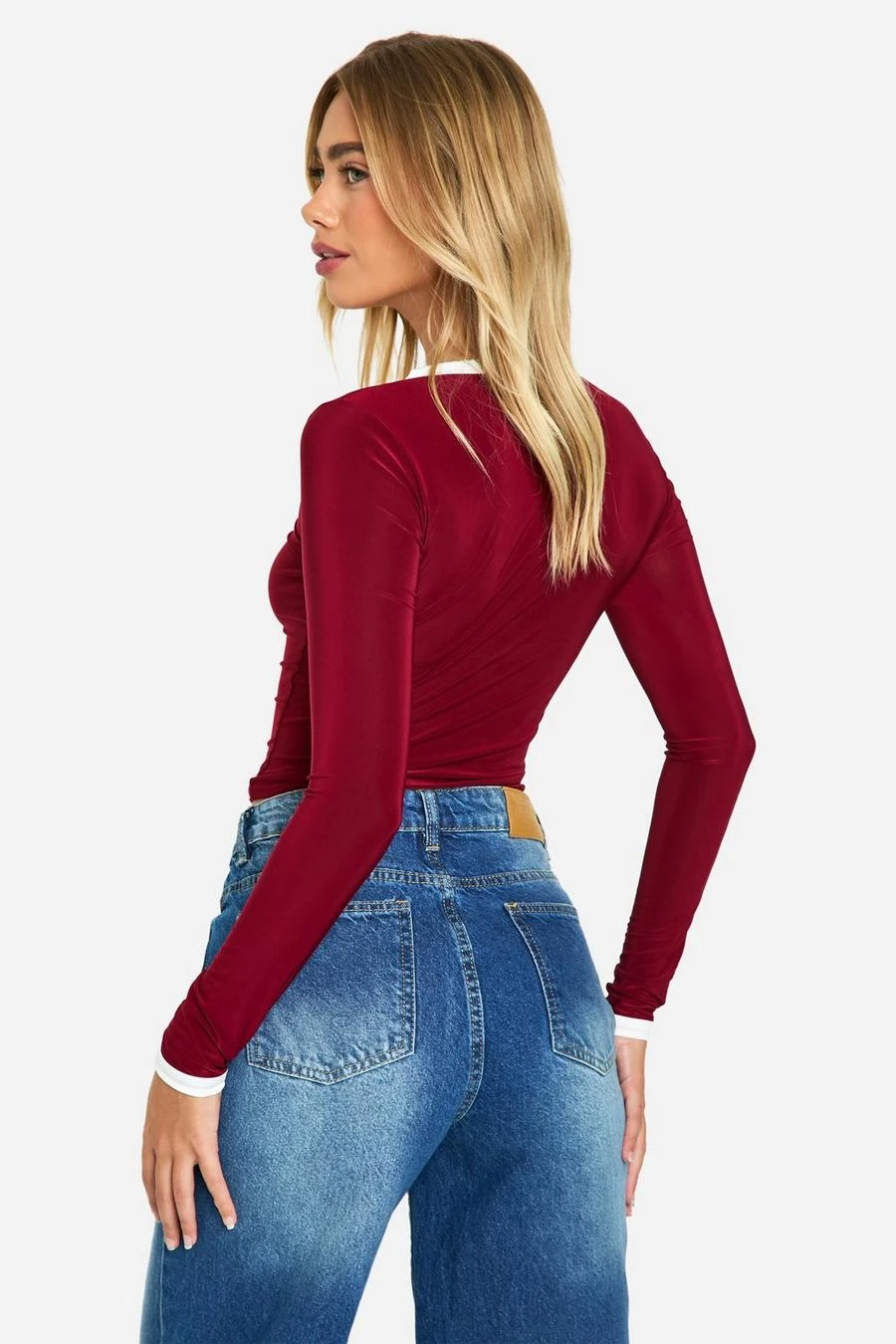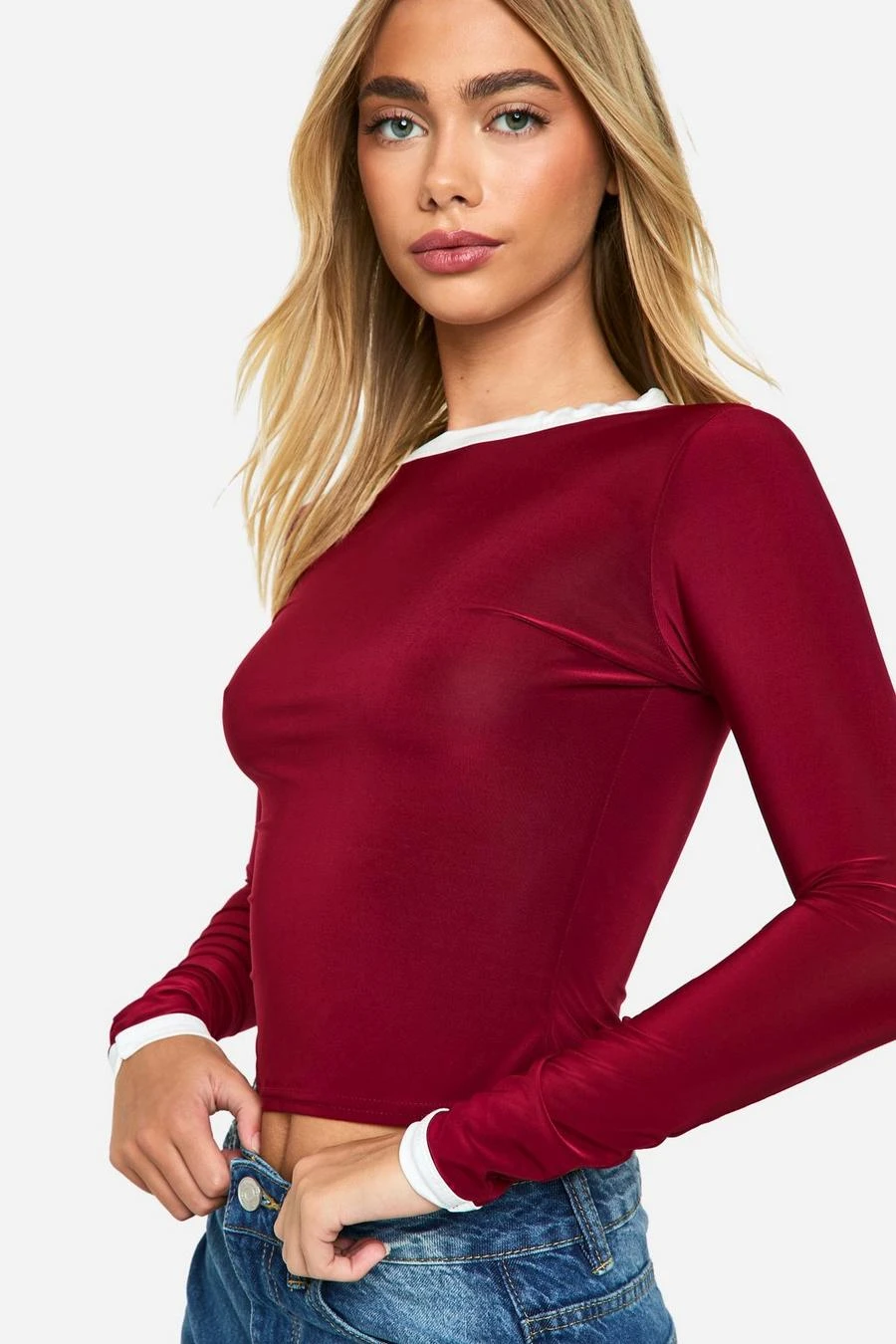 BOOHOO Slinky Contrast Binding Long Sleeve Top